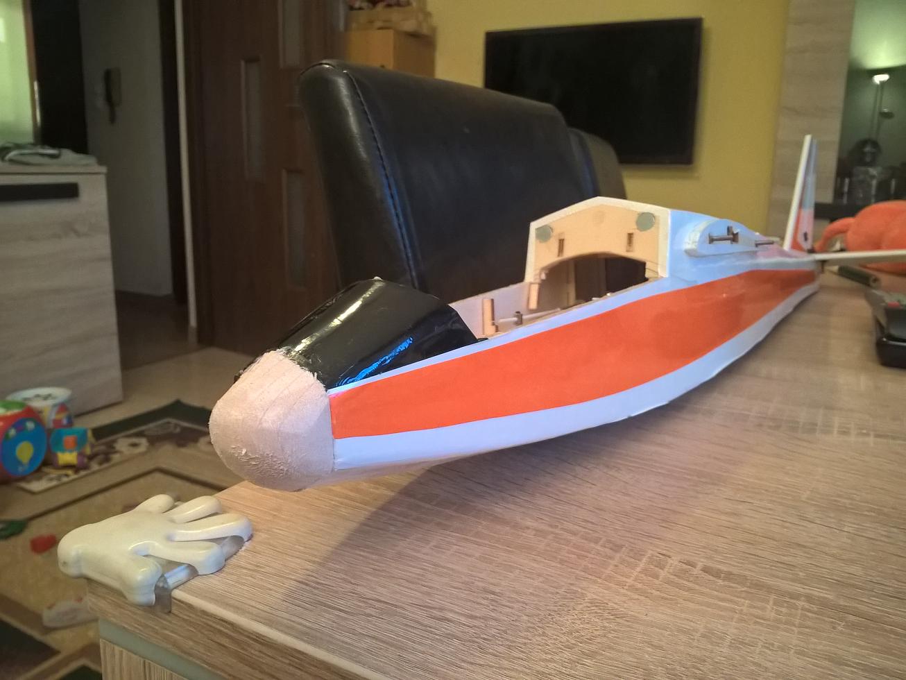 Budowa zakończona. Model ostatecznie wyważyłem. Wg. programu SC jest w zakresie 54,4 ÷ 66,9mm od krawędzi natarcia, mierząc przy kadłubie. Do oblotu wybrałem wartość 60mm i tak wyważyłem model.