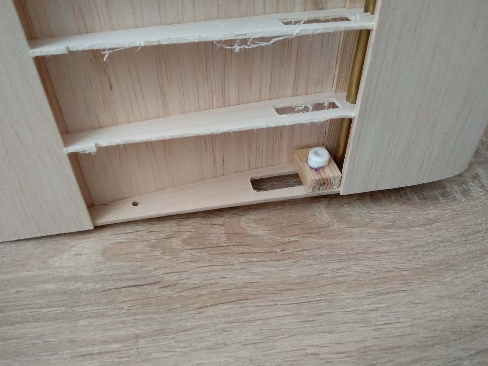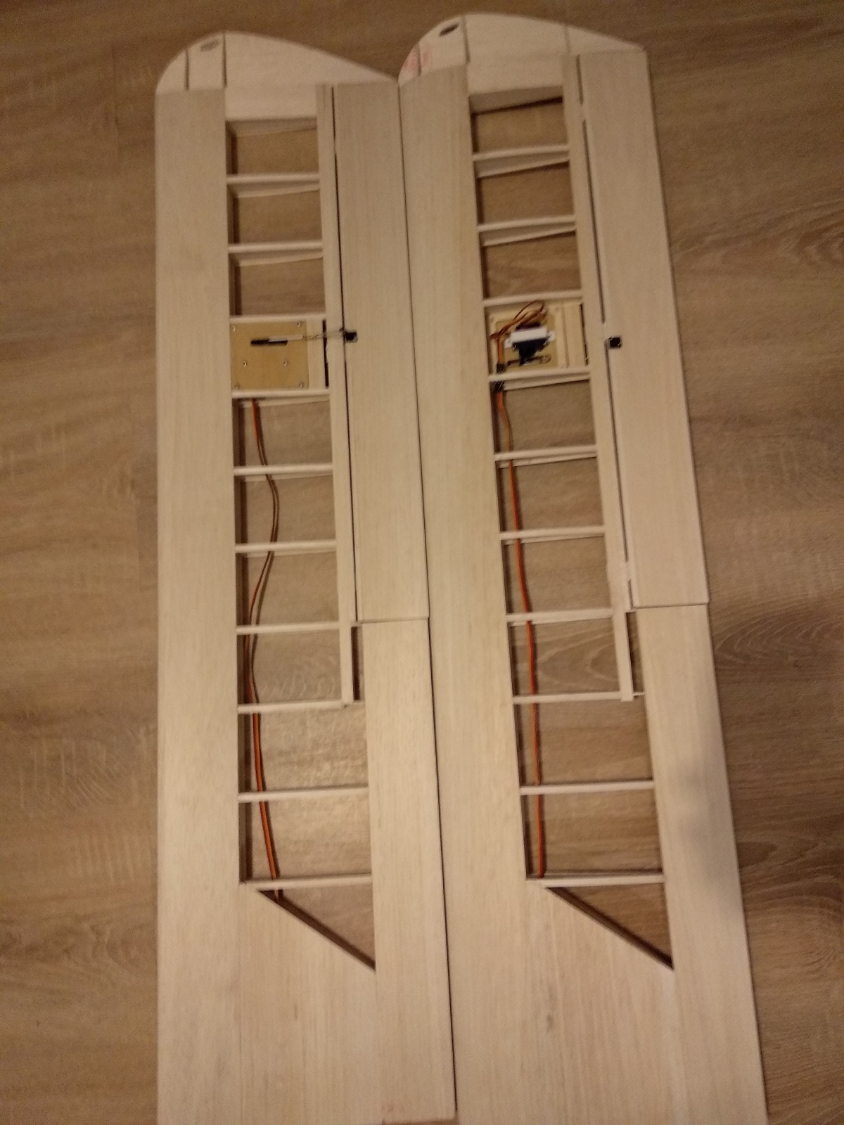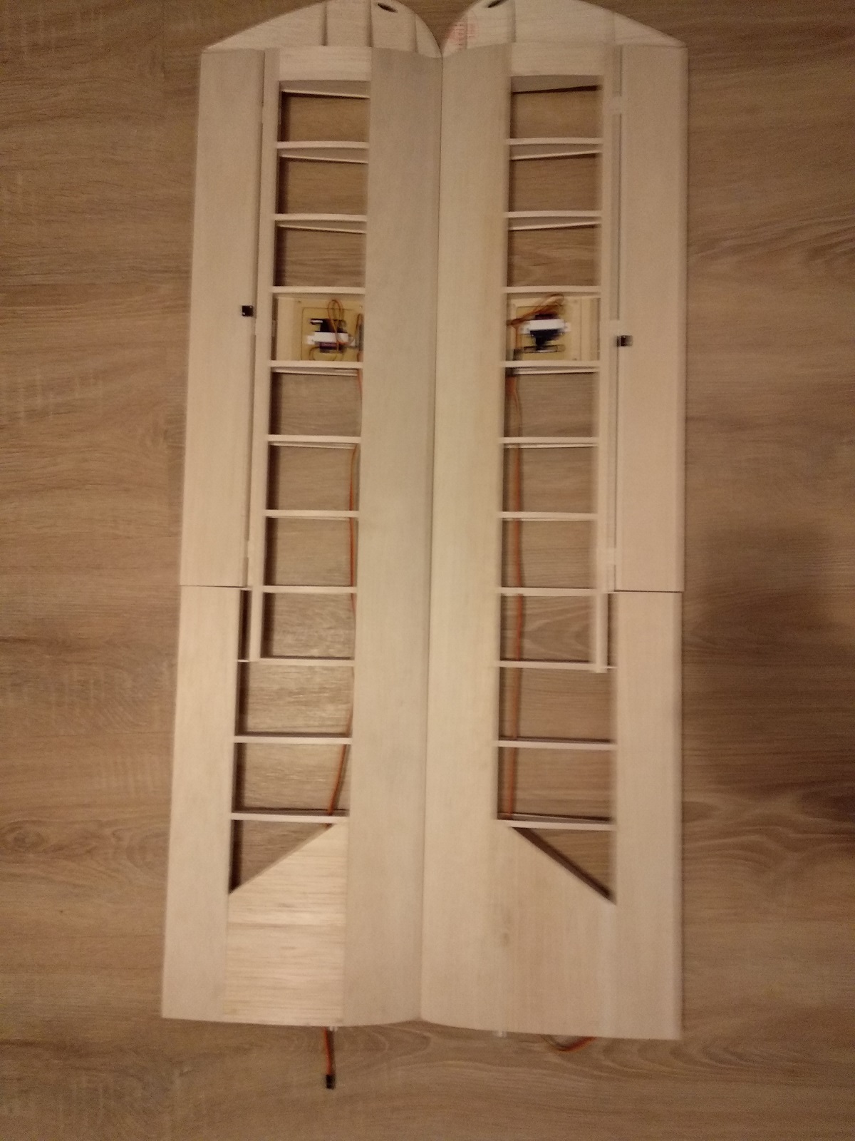 Następnie rozciąłem folię na skrzydłach w wpasowałem klocki drewniane. Są podszlifowane, tak że wchodzą między dźwigary, dotykając przekładki i żebra.