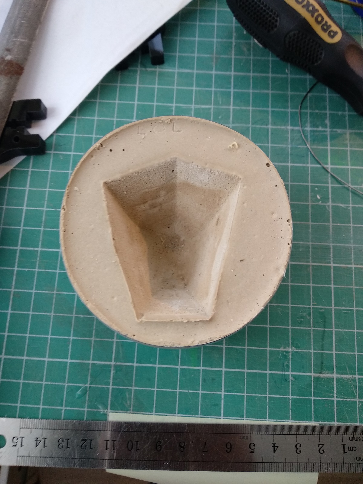 Elegancki drewniany nosek, posłużył do zrobienia formy gipsowej, do której wlałem 200g roztopionego ołowiu.