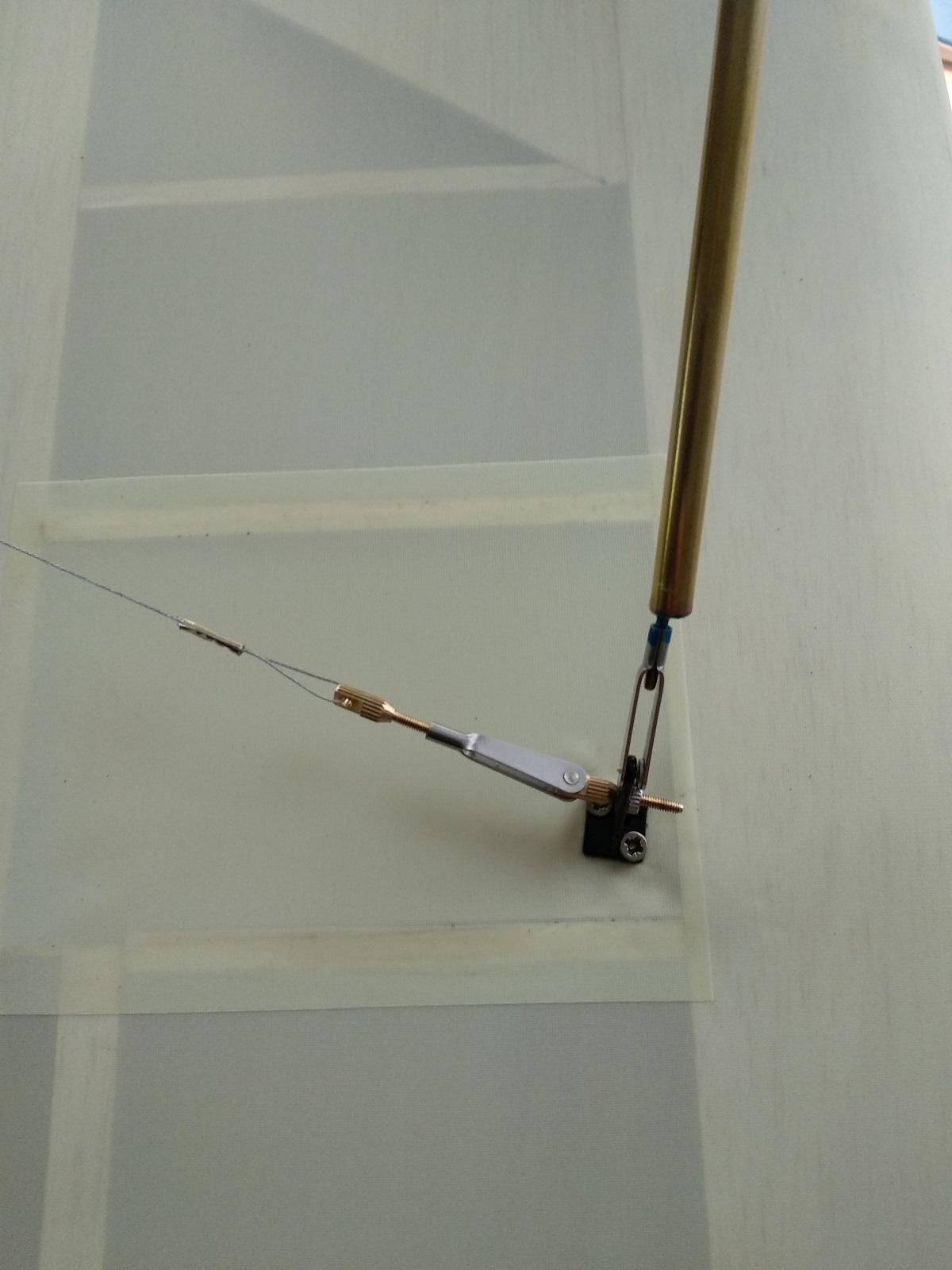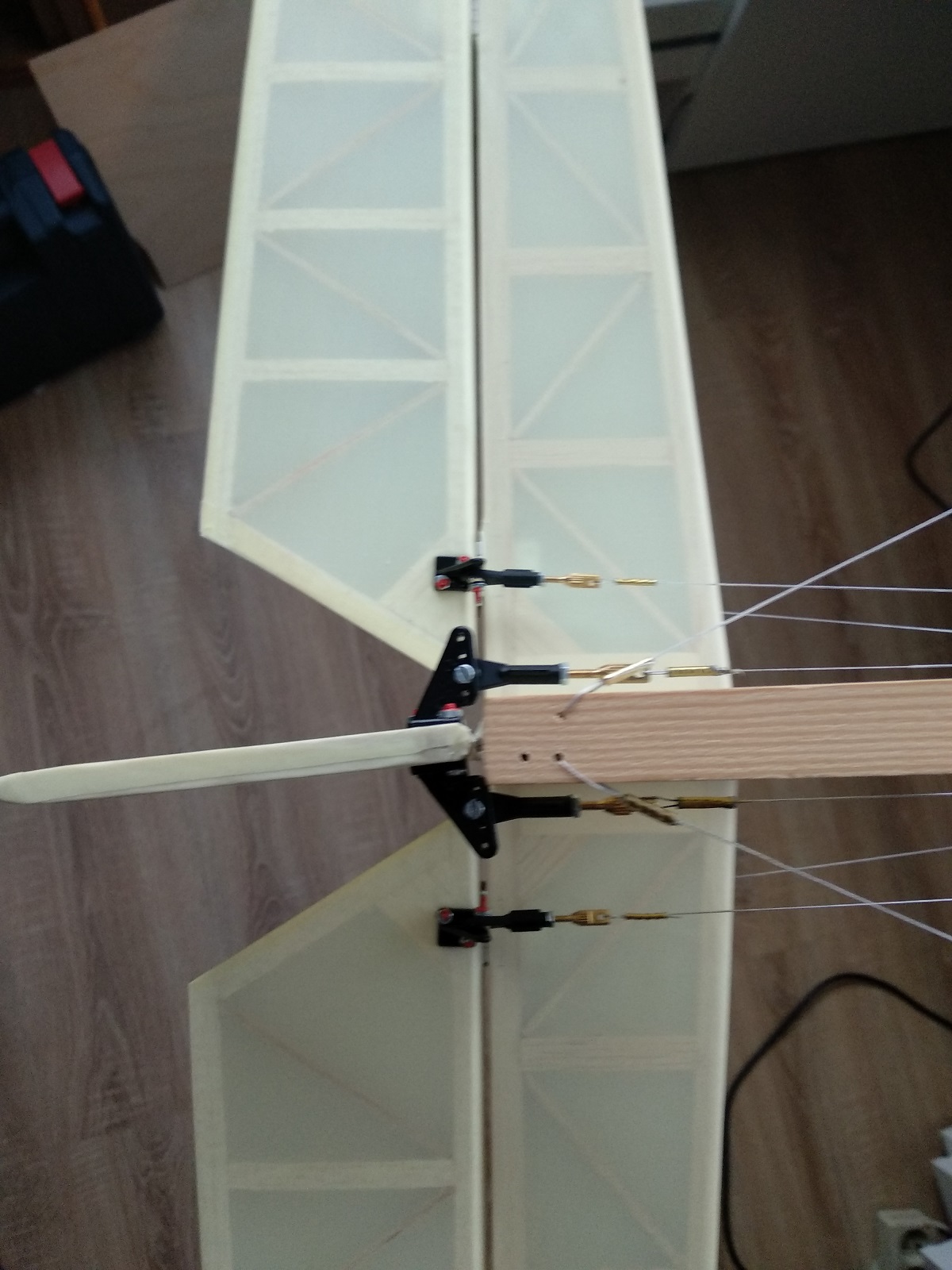 Z duralu 1,5mm zrobiłem łącznik, spinany z zastrzałami na spinki. Zastrzały to rurka miedziana zakończona zalutowaną końcówką do bowdena, też miedzianą. To tak dla jakiejkolwiek regulacji.