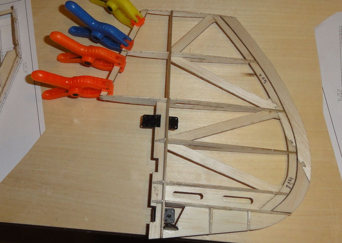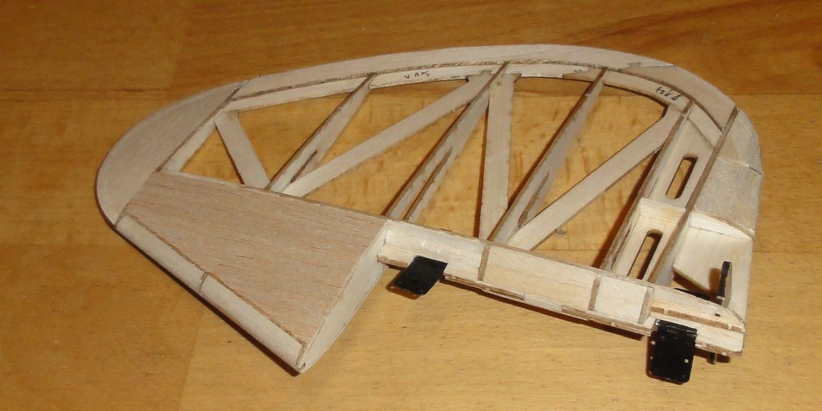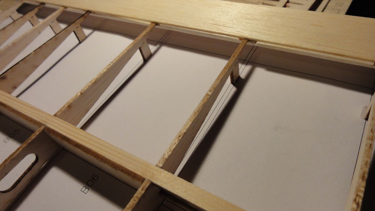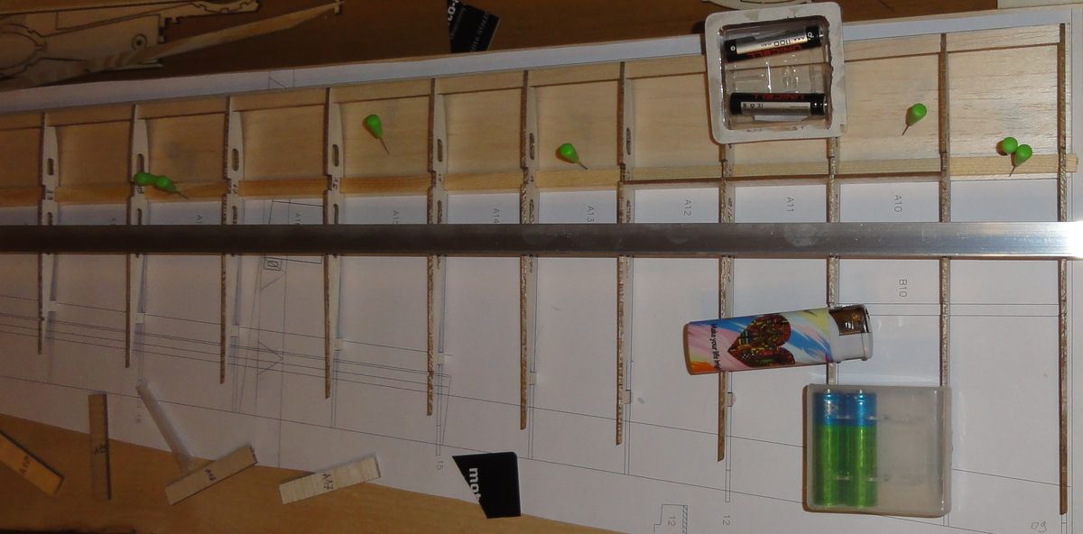 Jak na pierwszy raz wyszło całkiem nieźle. Jedynie o czym trzeba pamiętać, to aby odgiąć na początku pierwszą listwę balsową o zadany kąt - nie może być ona prosta. Ale po klejeniu też udało się ją nagiąć i przykleić aby bez obciążenia była w prawidłowym położeniu (stykała się z wzornikami).