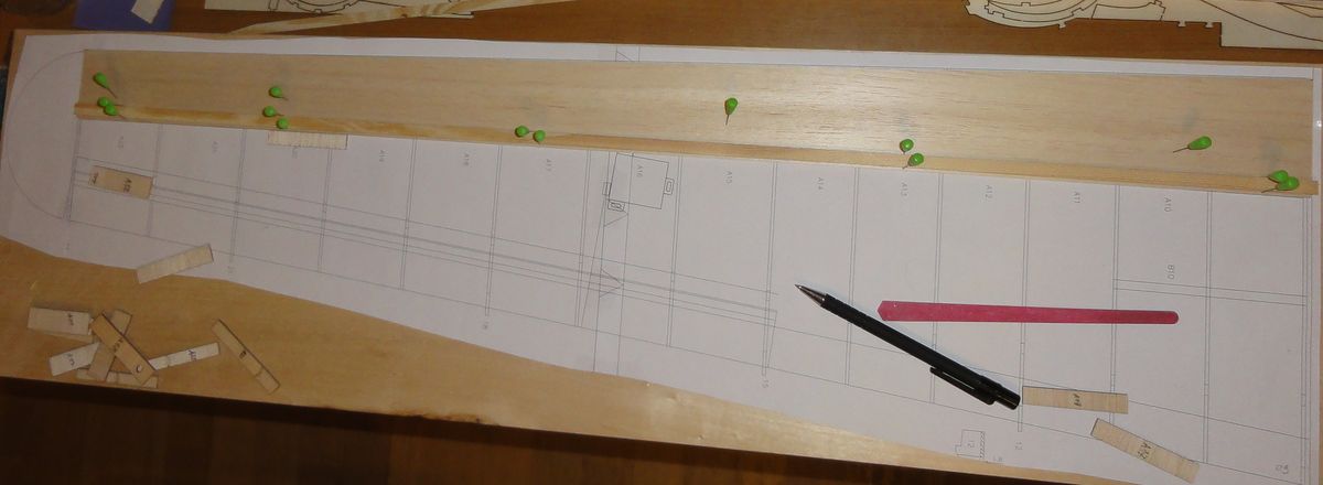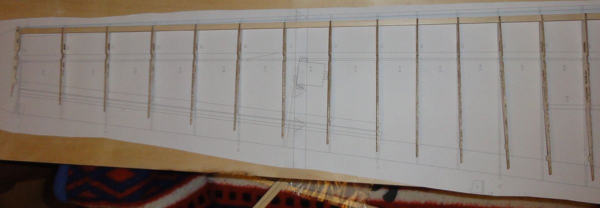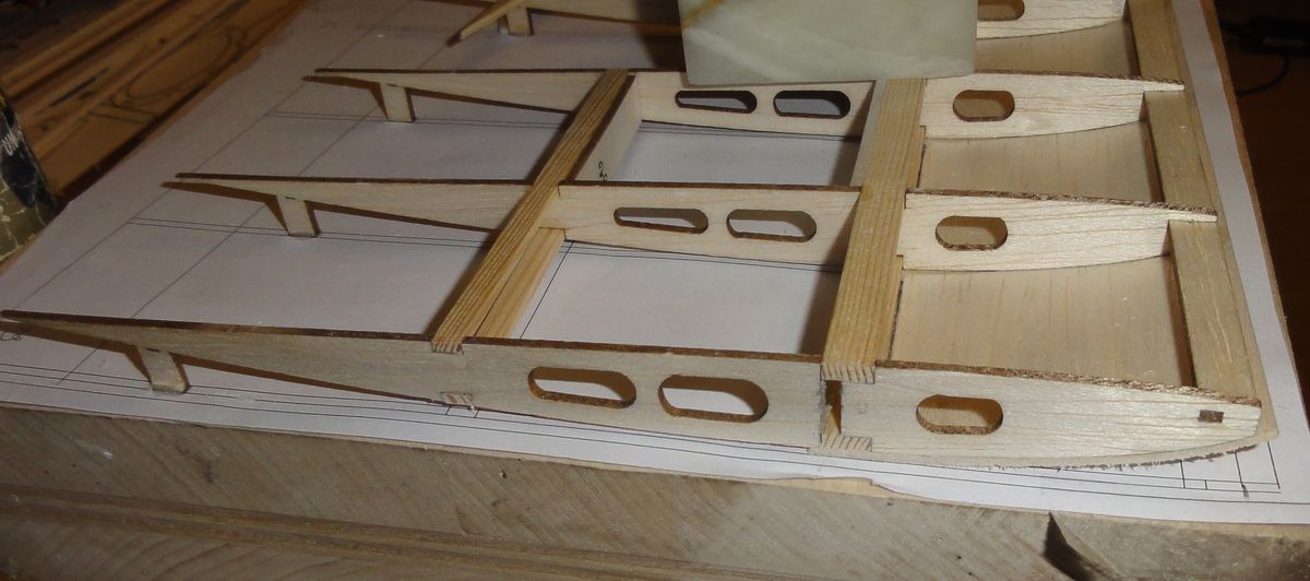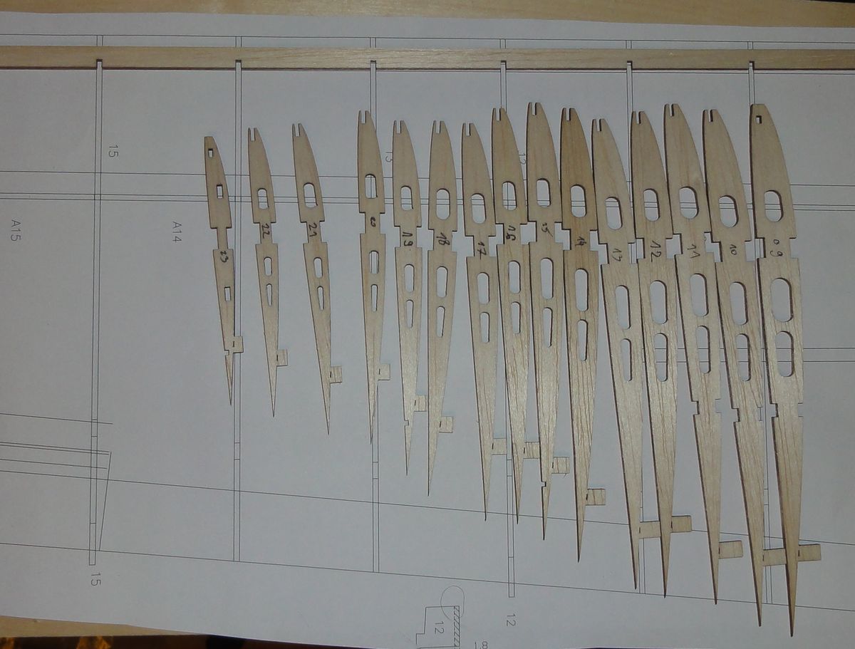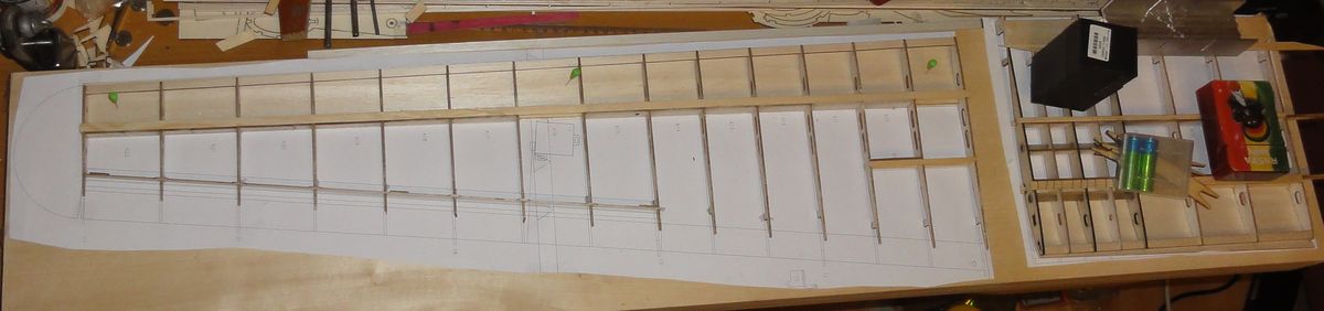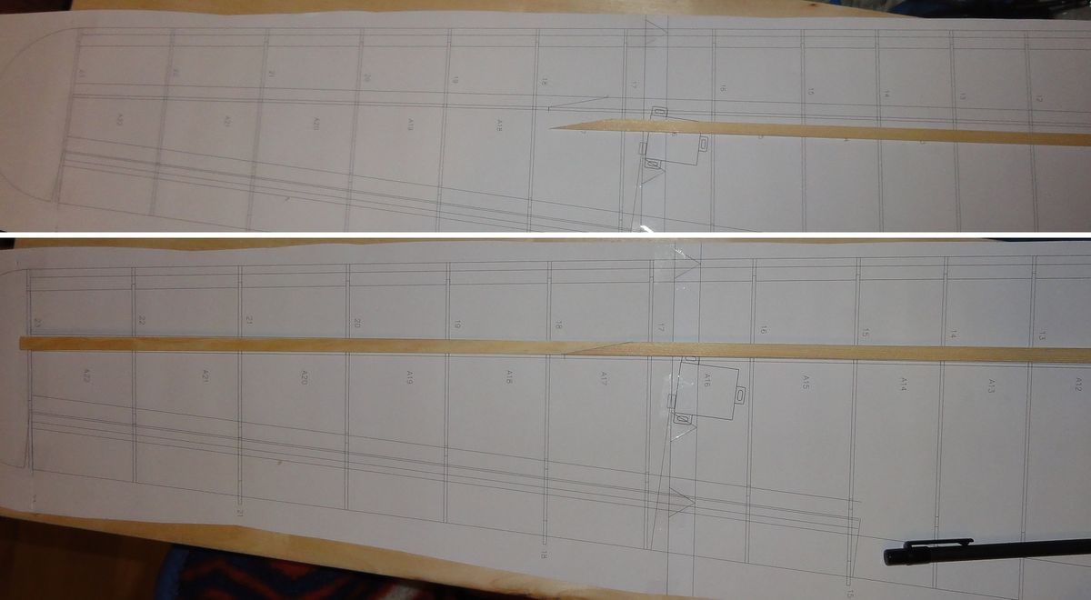 Jak na pierwszy raz wyszło całkiem nieźle. Jedynie o czym trzeba pamiętać, to aby odgiąć na początku pierwszą listwę balsową o zadany kąt - nie może być ona prosta. Ale po klejeniu też udało się ją nagiąć i przykleić aby bez obciążenia była w prawidłowym położeniu (stykała się z wzornikami).