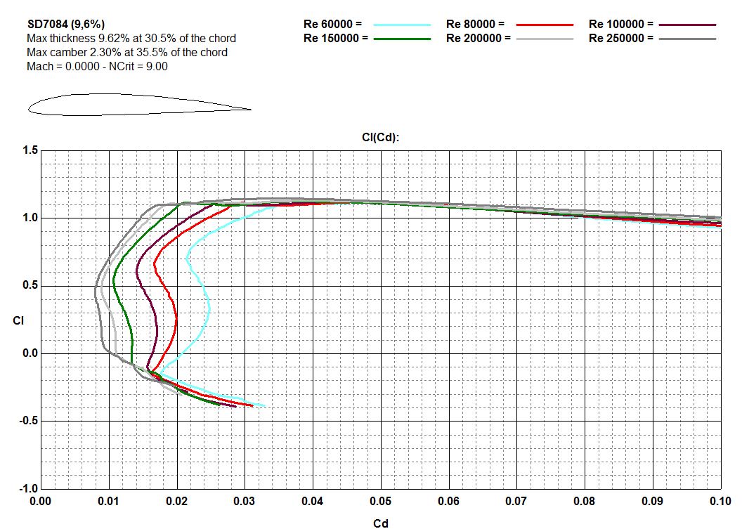 Tomek, Chciałbym zaproponować zmianę profilu. SD7084 ma duży opór przy większych prędkościach (słaba penetracja) a także bąbel laminarny przy mniejszych (wklęsły wykres przy srednich CL).