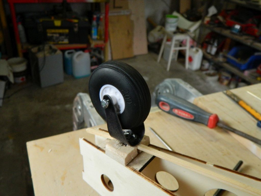 Ostatnie dwa dni zastanawiałem się jak zamontować koło ogonowe. Zastanawiałem się również czy wykonać je sterowane czy nie. Po kilku rozmowach zadecydowaliśmy, że koło będzie "wolne", czyli nie sterowane i swobodnie zamocowane. Jako podstawę goleni tylnej wykorzystałem kawałek sklejki lotniczej 3 mm, w niej nakrętka kłowa M3, na to wszystko odpowiednio wyfrezowana nakładka z w/w sklejki, wszystko sklejone na Distal, a całość wklejona między boczki kadłuba. Przykleiłem również kawałki balsy 8 mm aby wzmocnić dolną podłużnicę, będzie przewiercona. Resztę pokażę jutro jak wyschnie klej. Wykonałem również od podstaw goleń podwozia z kawałka blaszki stalowej.