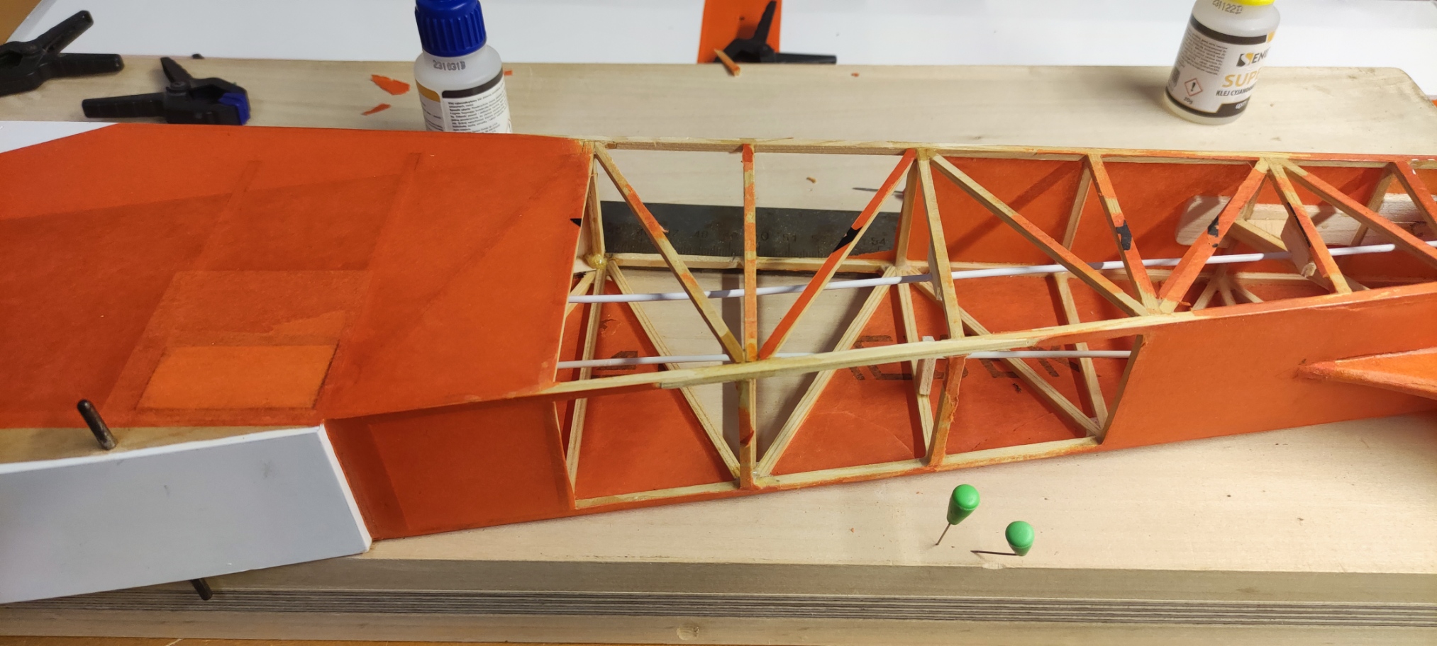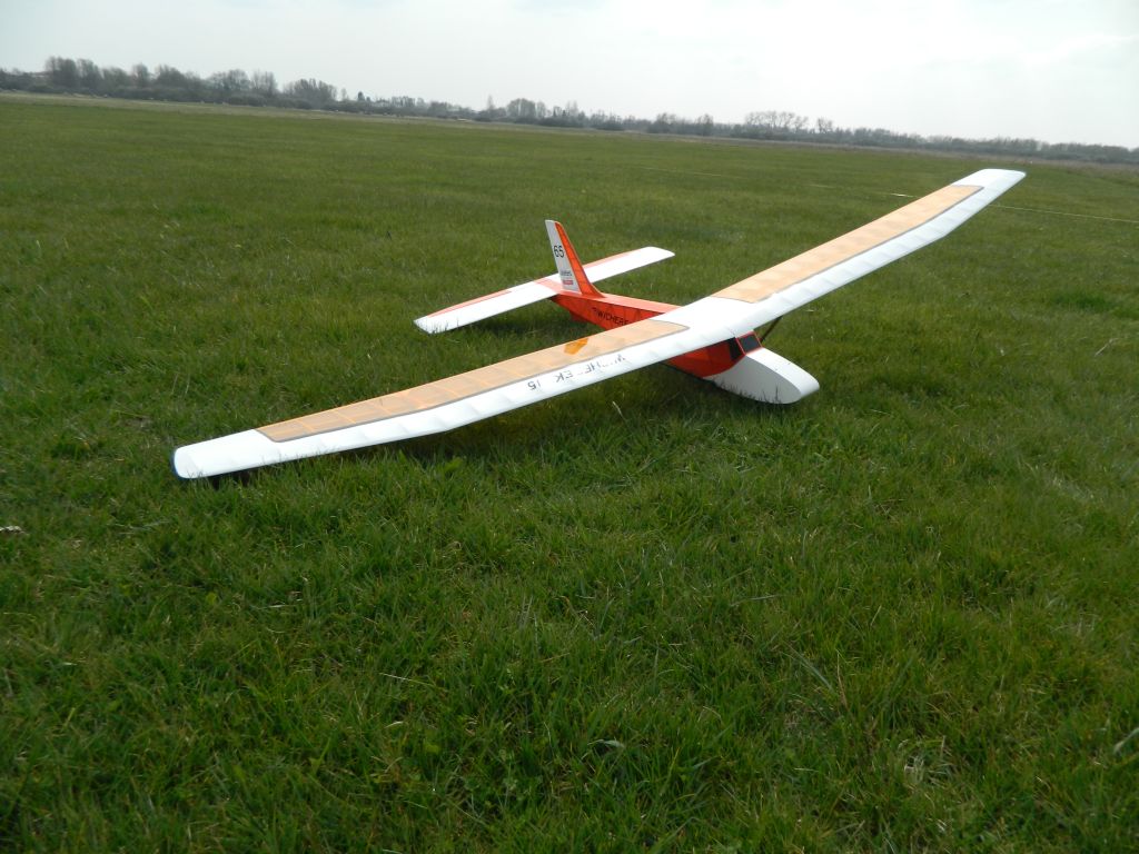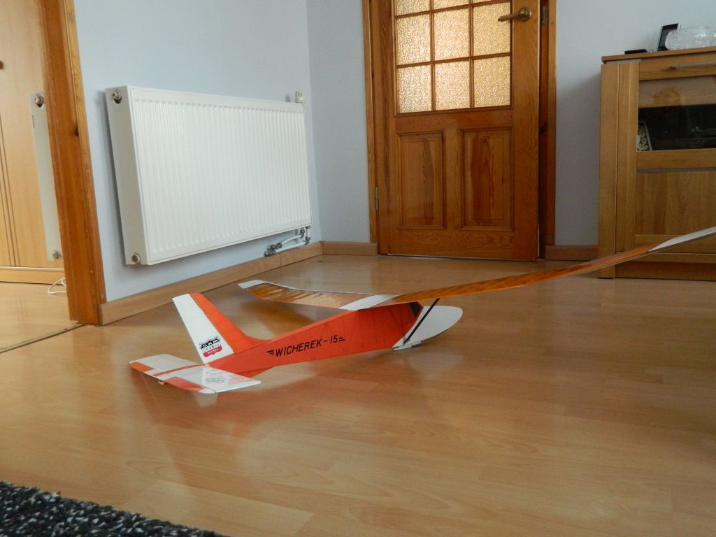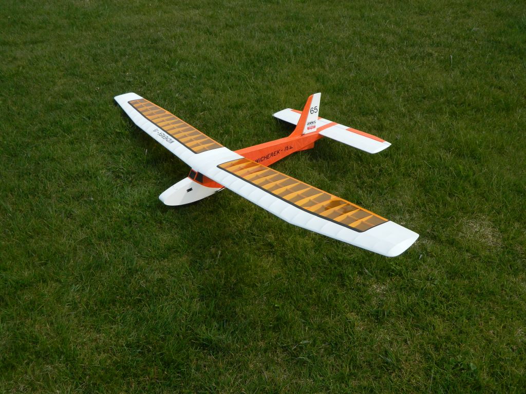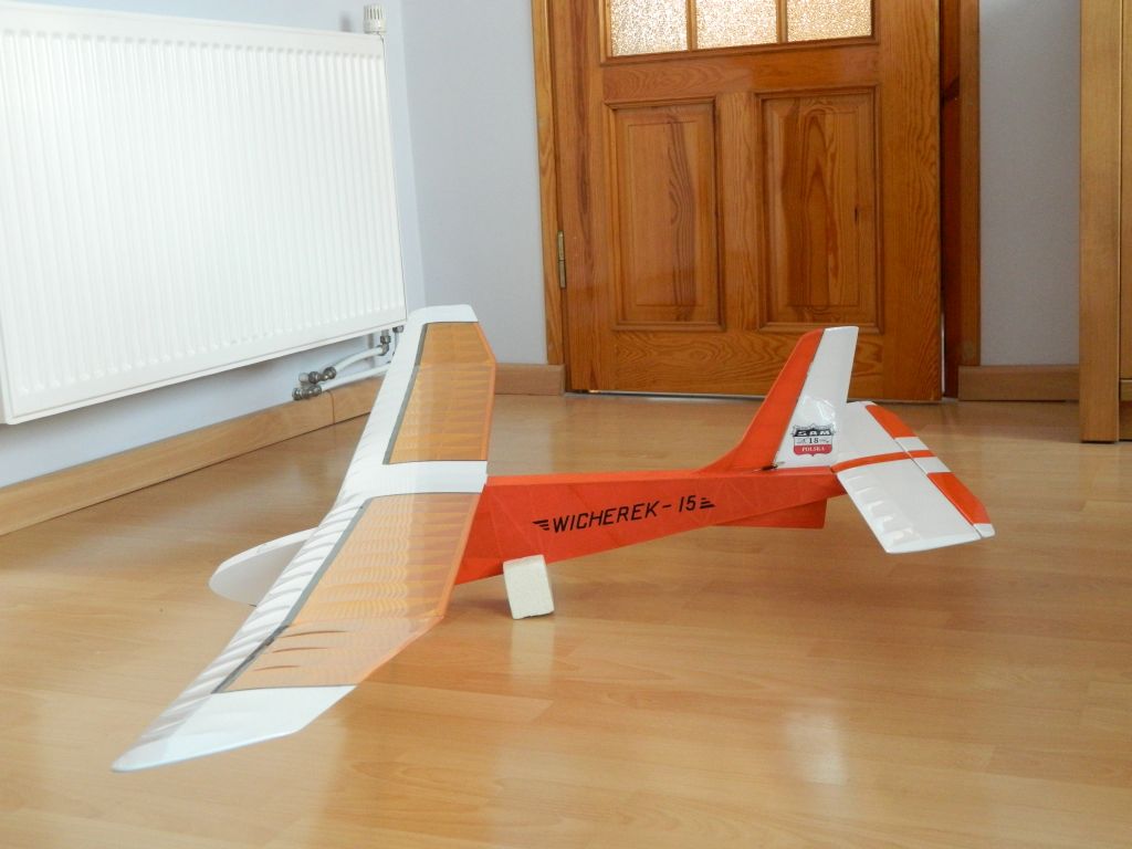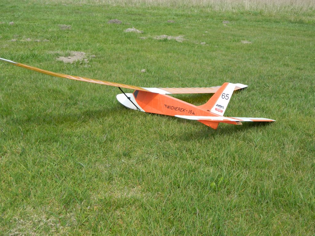 . Każdy stan lotu przewidywalny i bez jakiś nieprzyjemnych akcji. Na pewno błędem z mojej strony było zaprojektowanie łączenia płatów tak jak w oryginale. Teraz zrobiłbym krótki łącznik stalowy. Wybitnie usprawniło by to montaż modelu przed lotami. Nic tylko latać Wicherkiem, bawić się nim w locie i odpoczywać patrząc na niego w czasie lotu. Kilka fotek z płyty lotniska, film postaram się zamieścić jak będę miał operatora