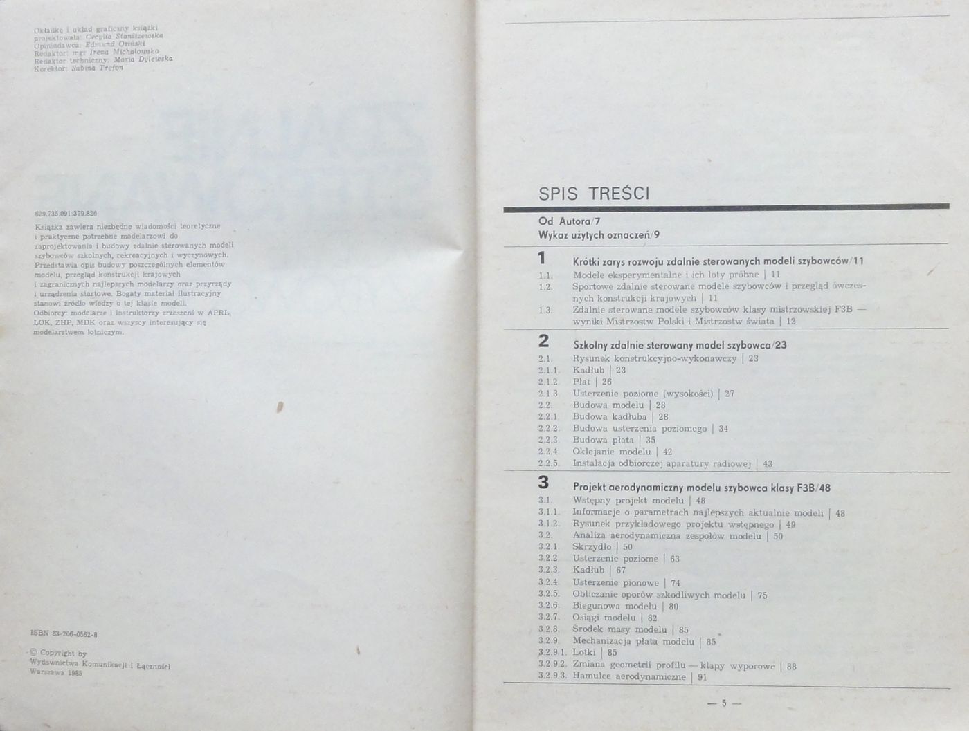 "Książka zawiera niezbędne wiadomości teoretyczne i praktyczne potrzebne modelarzowi do zaprojektowania i budowy zdalnie sterowanych modeli szybowców szkolnych, rekreacyjnych i wyczynowych. Przedstawia opis budowy poszczególnych elementów modelu, przegląd konstrukcji krajowych i zagranicznych najlepszych modelarzy oraz przyrządy i urządzenia startowe."