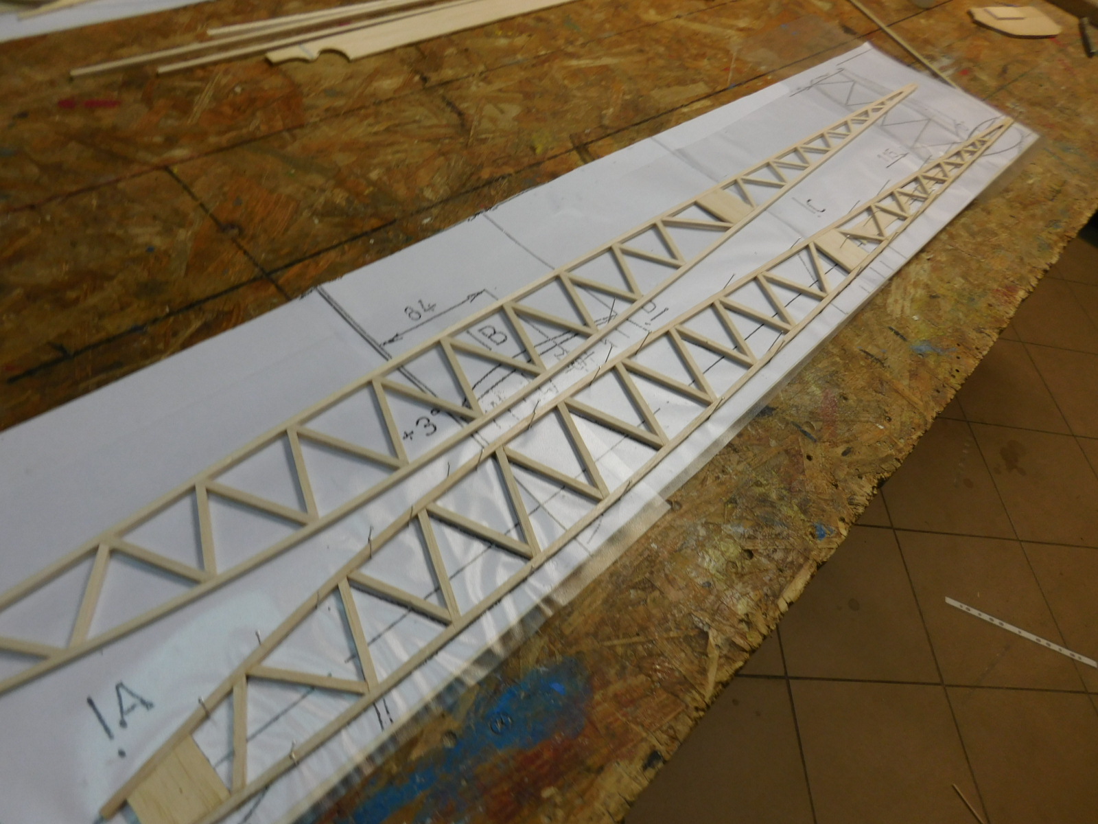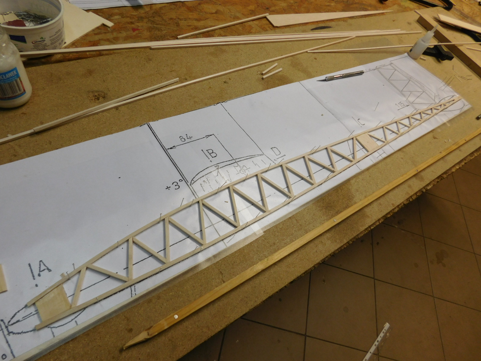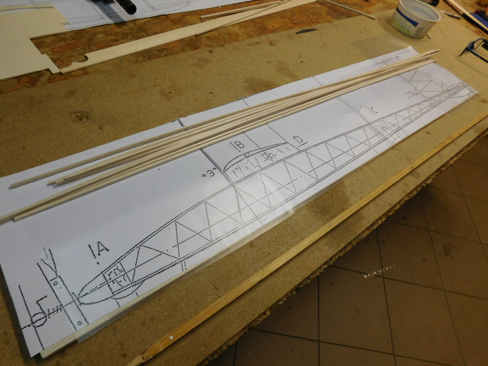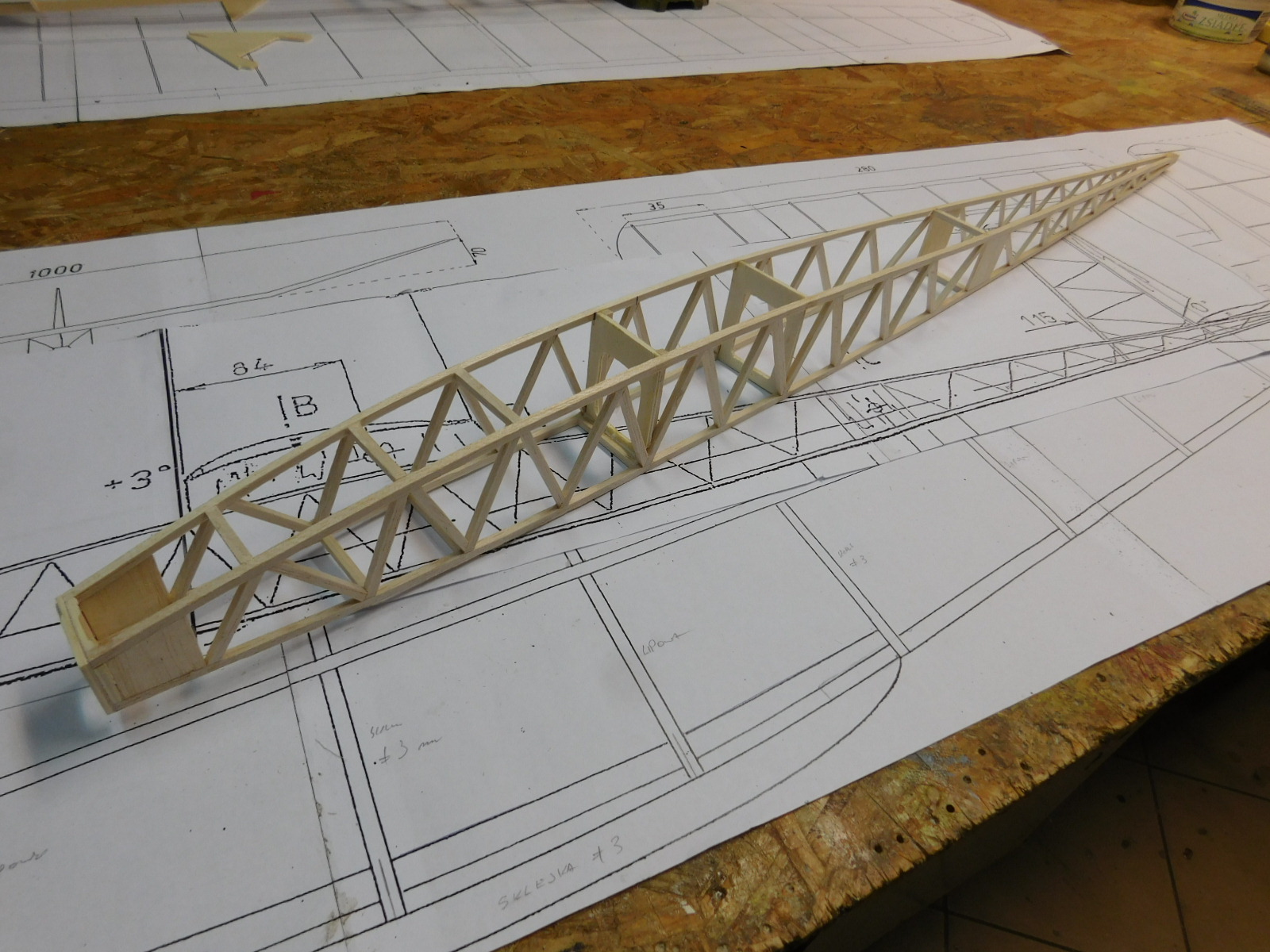 Kadłub: listewki balsowe 4x4 i 3x3 mm, wręgi sklejka lipowo-balsowa 3 mm