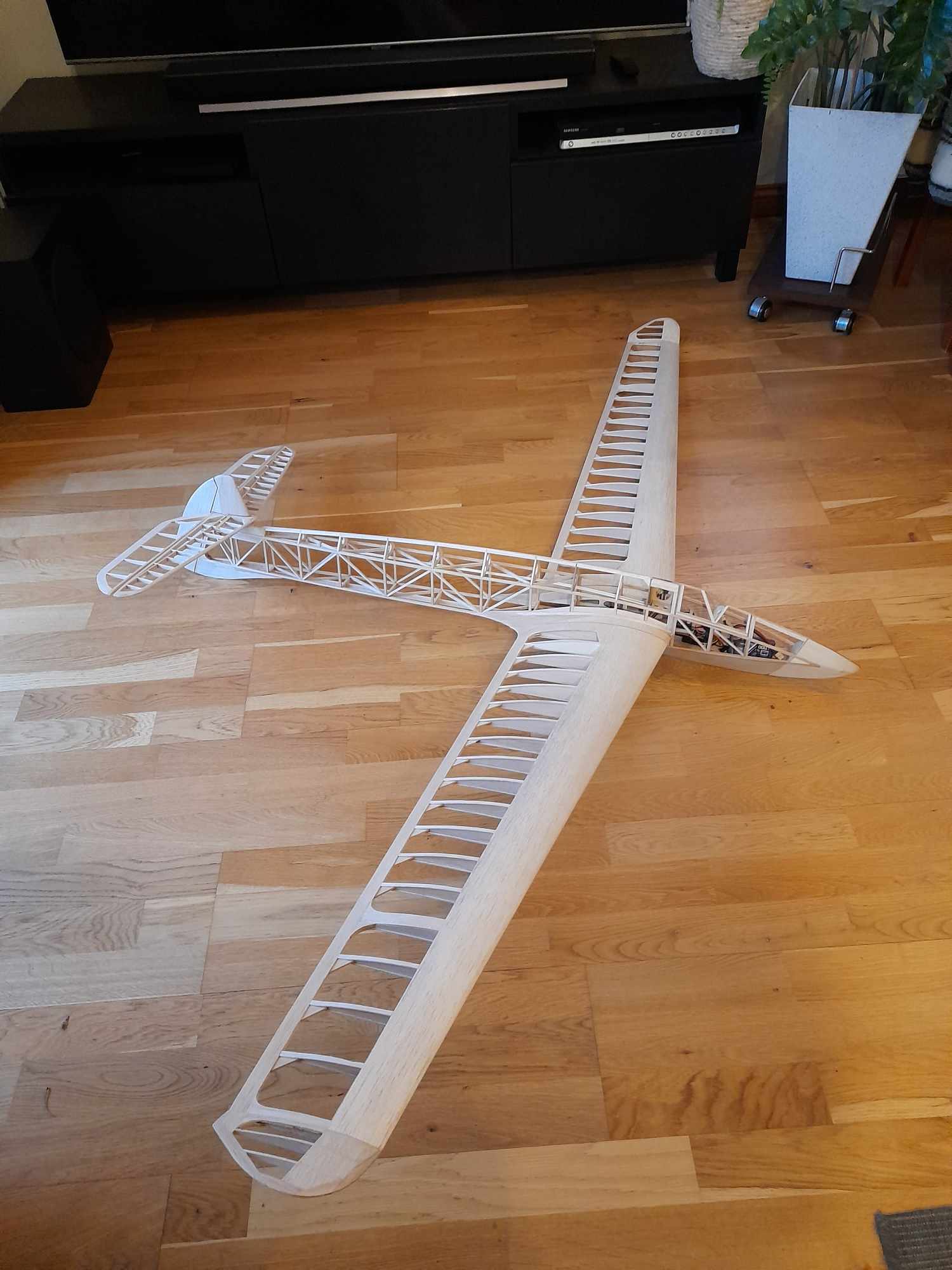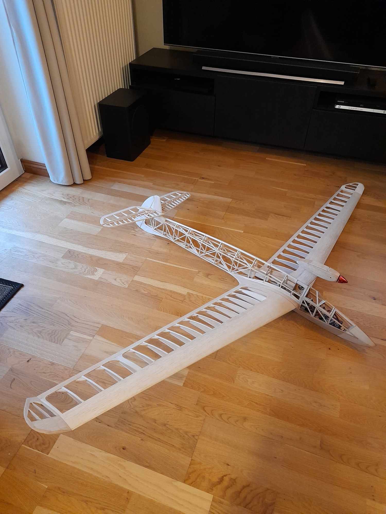 Model został powiększony w stosunku do pierwowzoru 1,2x rozpiętość 2160mm długość 1242mm powierzchnia nośna 37,8dm2 profil nasadowy RAF32 13%przechodzący w NACA 4409.