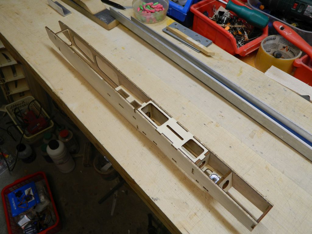 Kadłub. Boczki kadłuba to balsa 2 mm oklejona od wewnątrz sklejką 0,6 mm. Na zdjęciach montaż "bez kleju" i co mnie zawsze niezmiennie cieszy w tym momencie, wszystko pasuje nie trzeba nic poprawiać :D .