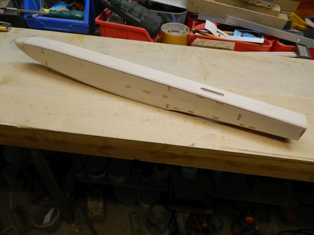 Budowa skrzydła zakończona. Zostało pokryć folią. Po konsultacjach z kolegami z Gdańska, bardziej doświadczonymi w budowie res-ów, to jest mój dopiero czwarty model tego typu ;) , wypełniłem kawałkami balsy przestrzenie między żeberkami przy krawędzi natarcia. Ułatwi to krycie folią. Ogólnie na tym polegała moja praca przez cały weekend. Oczywiście również na szlifowaniu struktury płata. Waga całości bez serw i folii na dzisiaj to 139 g.