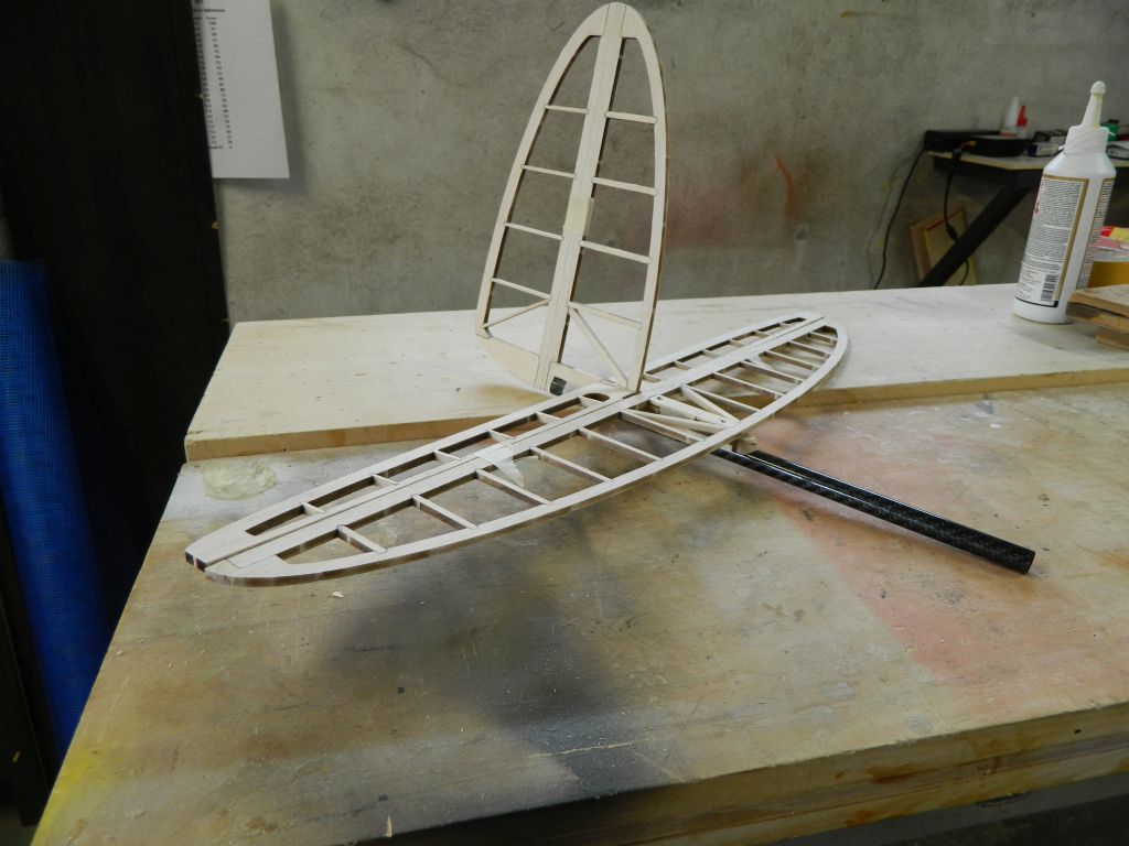 Kadłub sklejony, przymiarka z usterzeniem na kawałku rury węglowej.