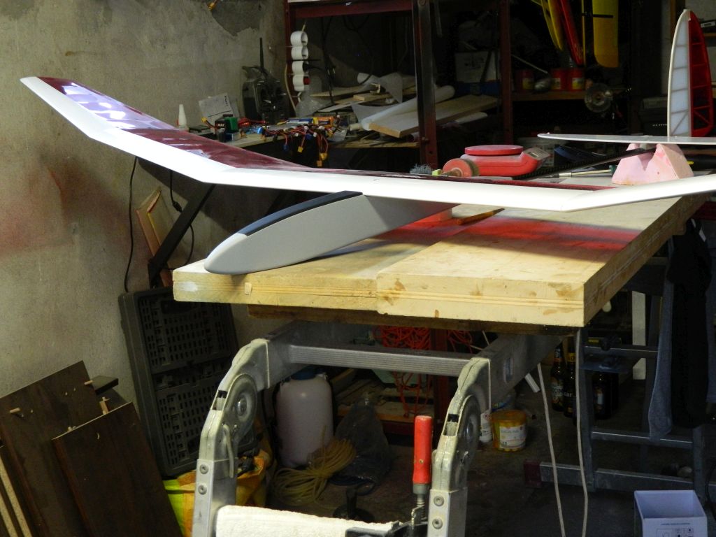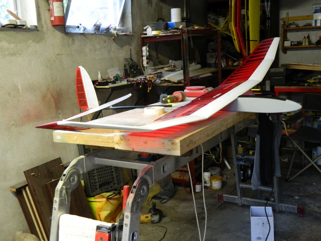 Na razie dobrze. Usterzenie całe po oklejeniu 28 g, kadłub w granicach 100 g.
