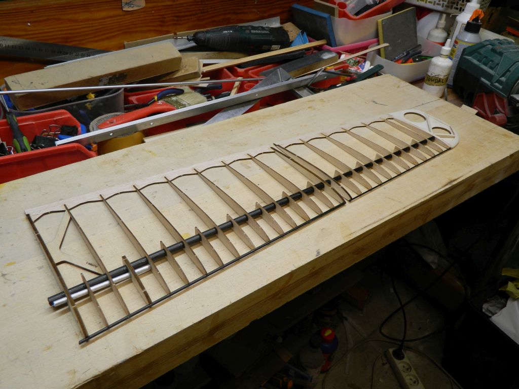 Zestaw profili podobny czyli od AG35 do AG38 z płynnymi przejściami w poszczególnych sekcjach, zmieniony obrys płata, cięciwy, wzniosy 8/8 stopni, przeprojektowany kadłub. Najważniejszą jednak zmianą jest wykorzystanie profili węglowych w strukturze szybowca. Jak na razie przewiduję tylko wersję F3L. Projekt zainspirowany modelem Purito i opiniami Tomka /mgr/. Zasadniczo skupiam się na obniżeniu wagi do lotu, co wyjdzie zobaczymy