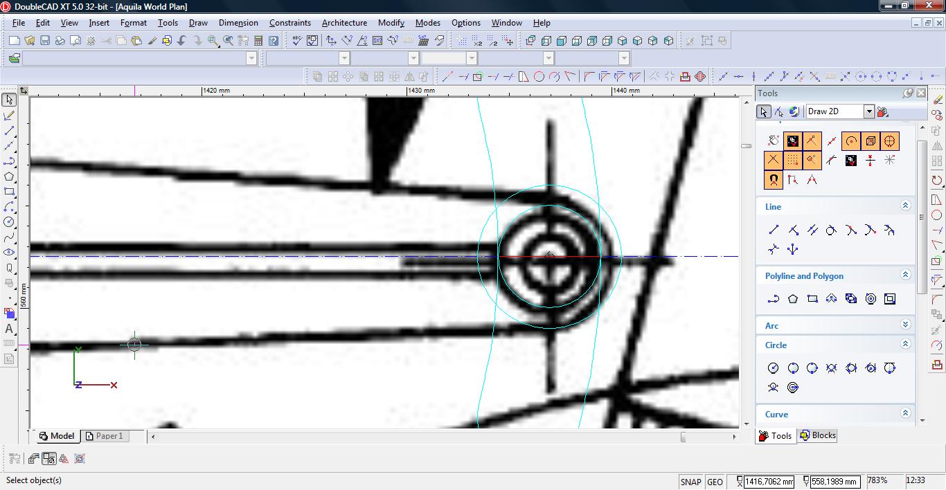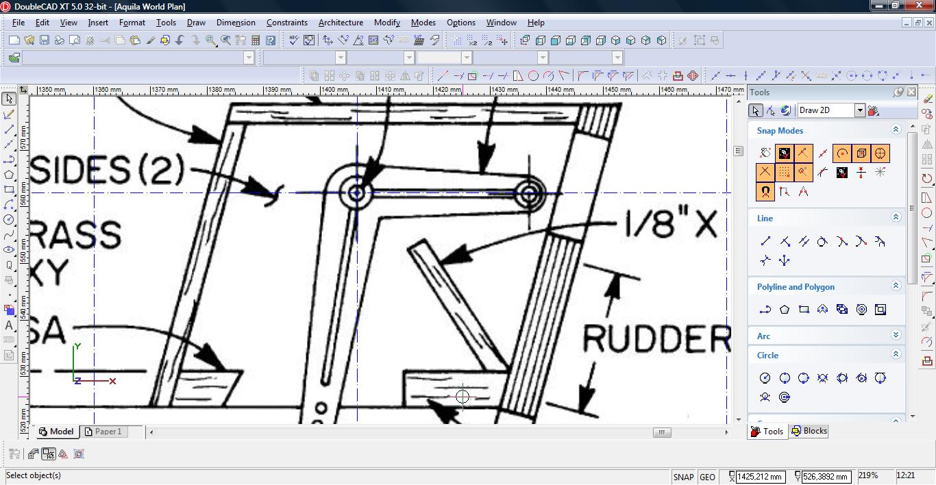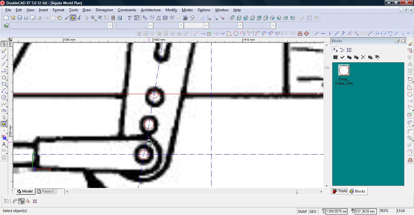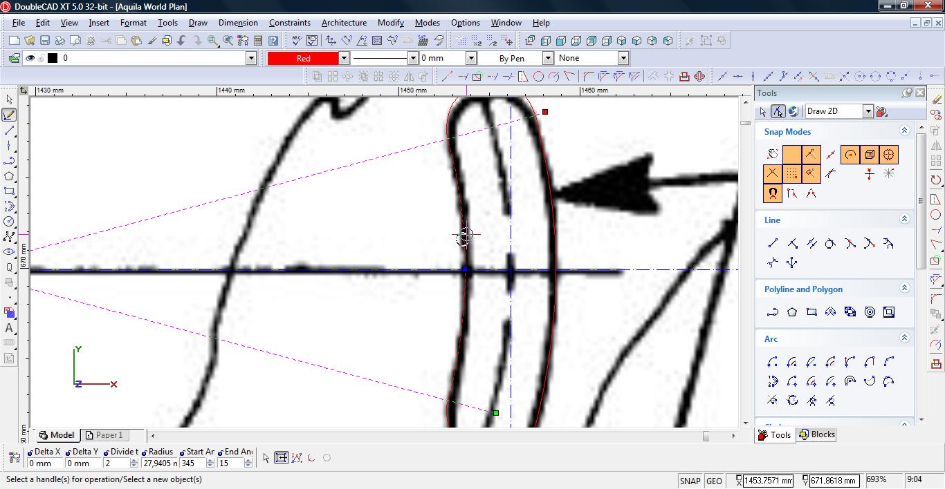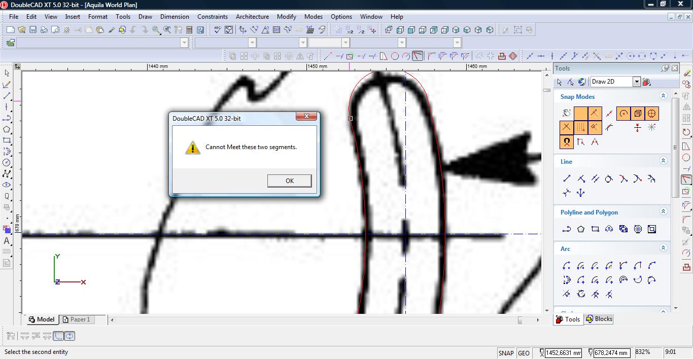 Teraz łączymy linię w pojedynczą polylinię. Wybieramy narzędzie Meet 2 Lines (Modify-> Meet 2 Lines)