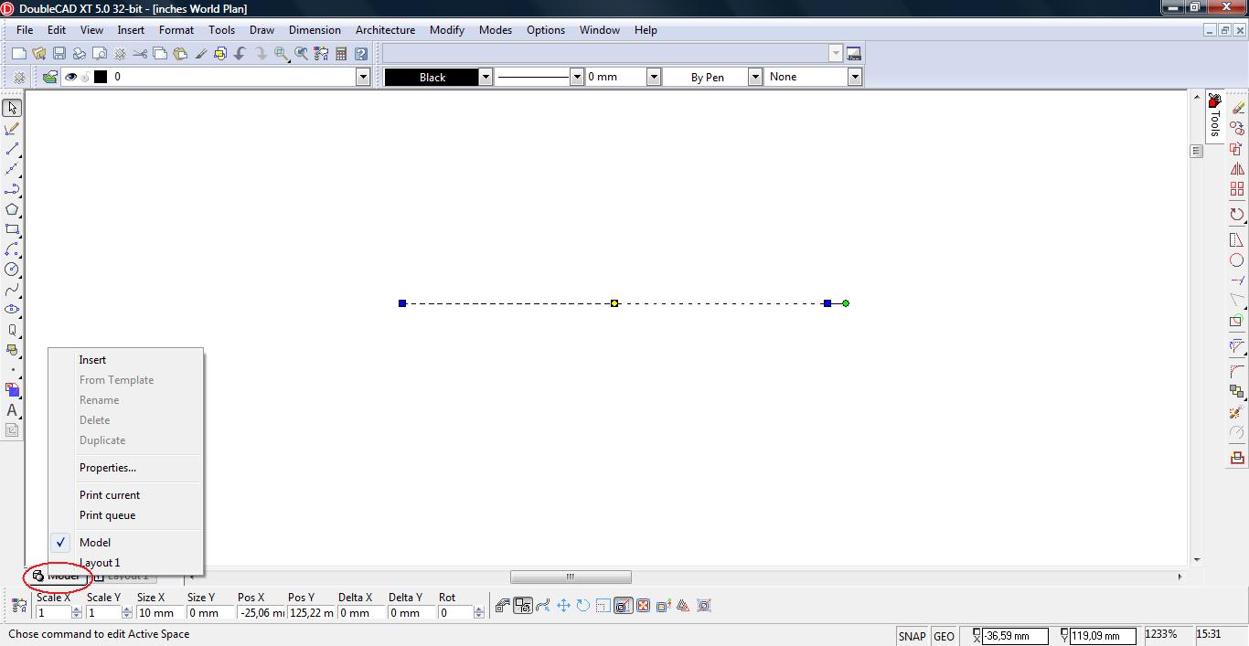 Zatem nasze 10mm, powinno być 10 calami, czyli 254mm. Konwersja jest dość prosta. Otwieramy nasz rysunek i klikamy prawym klawiszem na zakładce model, by wyświetlić właściwości rysunku.