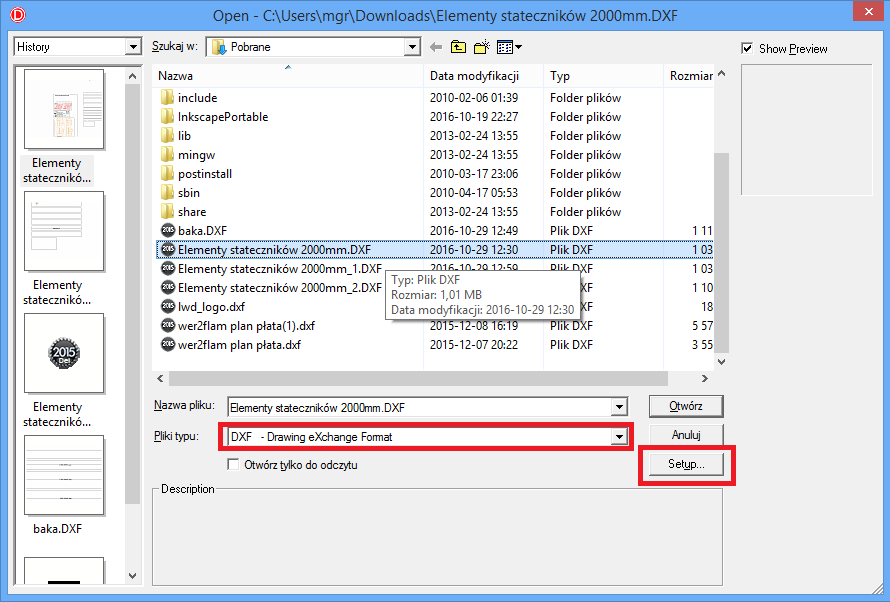 Felernym plikiem był plik z AutoCad, *.DXF, wybieramy zatem filtr na ten typ pliku, pojawia nam się przycisk setup.