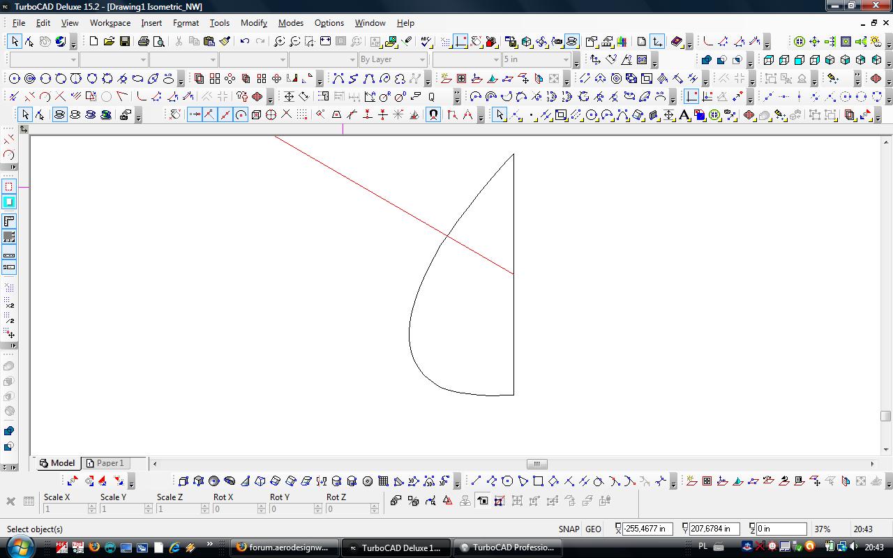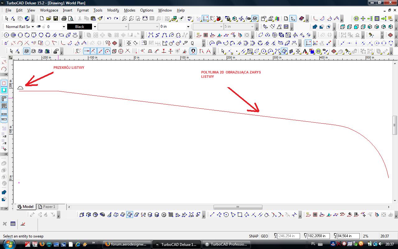 Jeden z kolegów zasygnalizował potrzebę poznania metody rysowania listew w TC. Ponieważ miałem z tym problem przy Pittsie zacząłem drążyć temat i opanowałem metodę wytwarzania wirtulanych listew giętych na różne sposoby. W pierwszej części opiszę przykład wykonania listwy po zdanej krzywej wyciągniętej z rysunku 2D . Do wyrysowania będzie potrzebny rysunek przekroju listwy w skali 1:1 i krzywa po której będzie narysowana listwa. Ponieważ mam już zrobiony obrys natarcia jako pojedynczą polylinię właśnie nią się posłużę. Obrys przekroju musi być obiektem zamkniętym a linia (prowadnica) jedną nie przeciętą polylinią. Jeżeli już mamy obrys linii i przekrój listwy musimy ten przekrój obrócić i przyłączyć do polylinii. Czyli przełączamy tryb 2D na 3D , wyłączamy NO SNAP i zaznaczamy nasz przekrój. Ustalamy punkt przyłączenia (edit reference point) i po obróceniu o 90stopni przyłączamy obrys do polylini. Obrys przekroju powinien się stykać z polylinią. W/w działania na screenach poniżej.