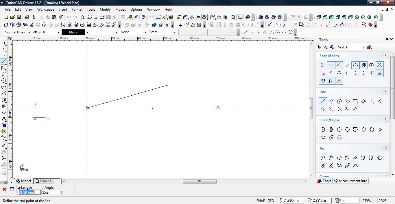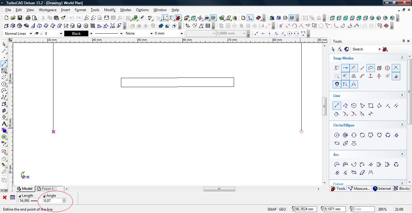 Zawsze podczas rysowania dowolnym narzędziem możemy szybko skoczyć do jego parametrów za pomocą klawisza TAB. Spowoduje to iż aktualne zadanie np. rysowana linia, jest jakby wstrzymana operacje myszą są zablokowane i wszelakie parametry możemy wstawić ręcznie np. długość czy żądany kąt pochylenia. Wartości możemy podawać dodatnie oraz ujemne np. aby obrócić linie o 270 stopni wystarczy wpisać -90.