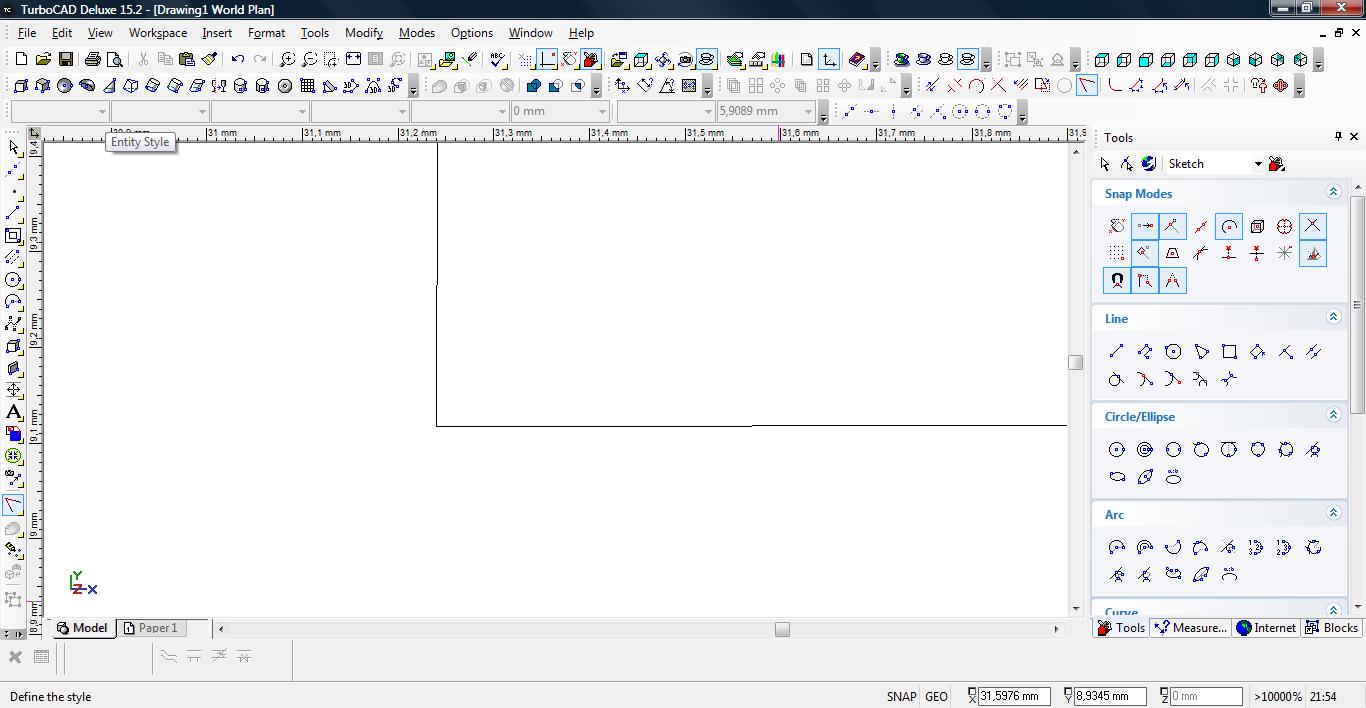 Gdy utworzymy nowy plik, TurboCad automatycznie wybiera i aktywuje dla nasz narzędzie do rysowania linii. Jeśli rysunek jest pusty, nie pozwala nam on zrezygnować z trybu edycji. Zatem aby zaspokoić to dziwne żądanie rysujemy dowolną kreskę lub zmieniamy na inne narzędzie np. polilinię etc.