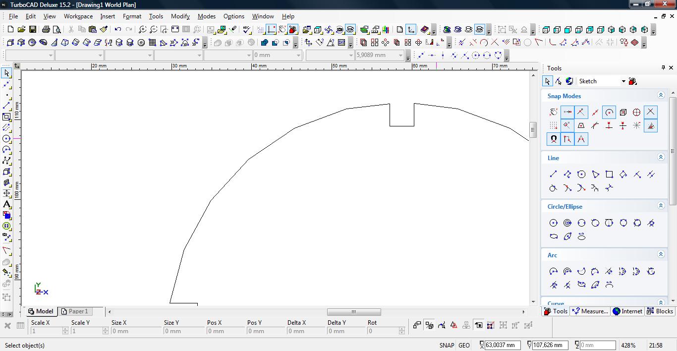 I tu napotykamy pierwszy błąd w TC 15 Deluxe – to przełączanie działa słabo, czasem wcale nie działa. Czasem po przełączeniu i aktywowaniu się osi Z, nawet po powrocie do widoku z góry, osie się nie przełączają z powrotem na X, Y a pozostają Y, Z. W tym momencie z reguły skaczę po widokach, oddalam rysunek i próbuję przeciągnięciem myszy zaznaczyć całość rysunku. Po kilku takich próbach udaje się przywrócić prawidłowy układ osi X,Y.