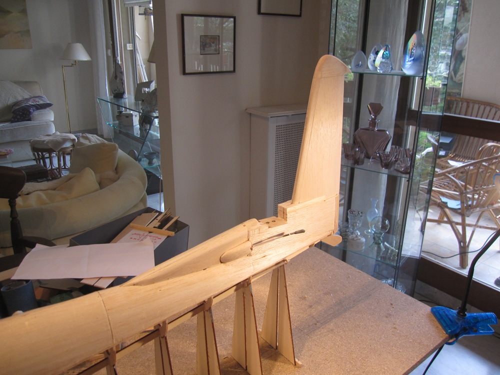 Tylny koniec centropłatu wzmocniłem sklejką 1mm opartą o podłużnice i mam wrażenie że to wystarczy. Pozwoliło mi to dodać „mięsa” na dodatkowy bagnecik (ustawiający). Statecznik pionowy wykonuję też z tej samej sklejki bo dla mnie jest to po prostu łatwiej (zwłaszcza że ciągle jeszcze nie dostałem przesyłki balsy). Byle do przodu....