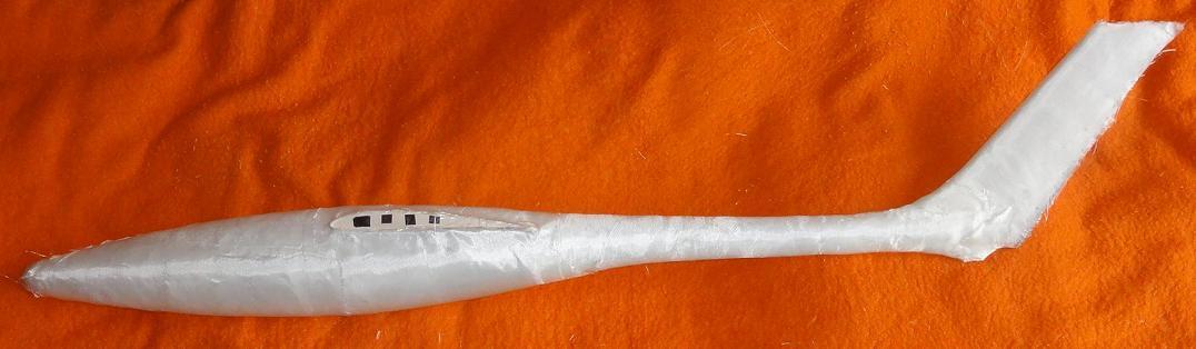 Dosyć duże rozczarowanie, zastanawiałem się czy nie połamać go spektakularnie kolanem (choć ciężko by było) i czy nie robić od nowa kadłuba konstrukcyjnego, ale postanowiłem że uratuję co jest (przynajmniej postaram się). Maska na twarz i szlifowanie na grubo całego kadłuba. Po dłuższym szlifowaniu w amoku, przetarłem kadłub na mokro i okazało się że zeszlifowałem prawie 20 [g]. Doszlifowałem się nawet za głęboko bo zebrałem trochę tkaniny głównie na belce kadłuba (na sucho jak przecierałem to wyglądało że jest ok - polecam na mokro sprawdzać). Dodałem sobie tym tylko pracy bo będę musiał wzmocnić ją od środka tkaniną. Następnie na całość położyłem warstwę żywicy i poczekałem na stwardnienie. Później kolejne szlifowanie, tym razem bardziej ostrożne i już widać że lepiej się to prezentuje. Odpyliłem na mokro całość i kolejny raz żywica (miejscowo z microbaloon-em). Po tych zabiegach masa całości została praktycznie taka sama jak na początku ale wiem że to ta bardziej "zła", bo zamieniłem częściowo tkaninę na żywicę. Liczę jednak, że warstw tkanin było z zapasem i będzie ok. Nie mam zdjęć z faz tych prac bo nie w głowie miałem robienie zdjęć podczas "nerwówki" z kadłubem. Tak to wygląda obecnie