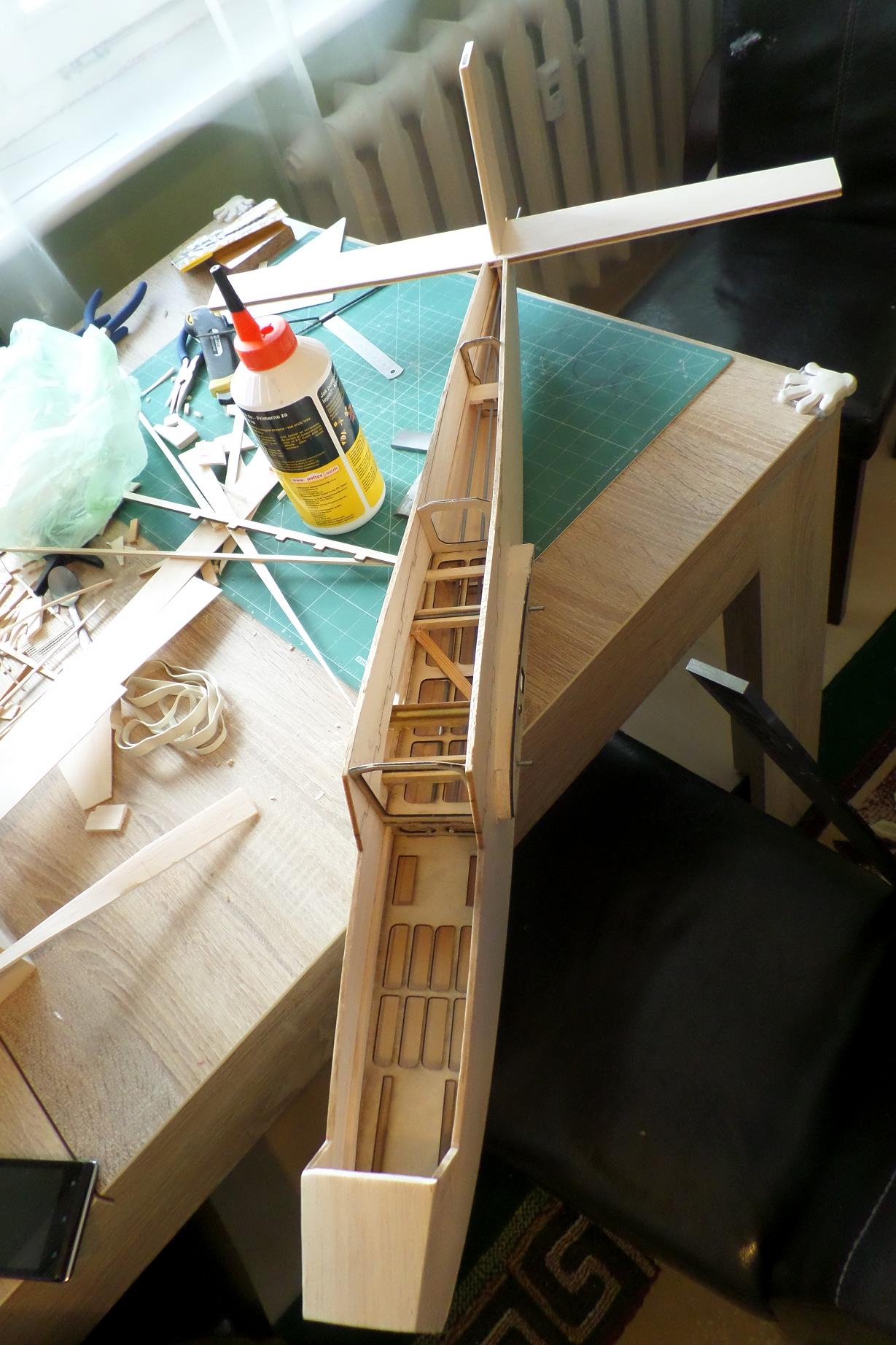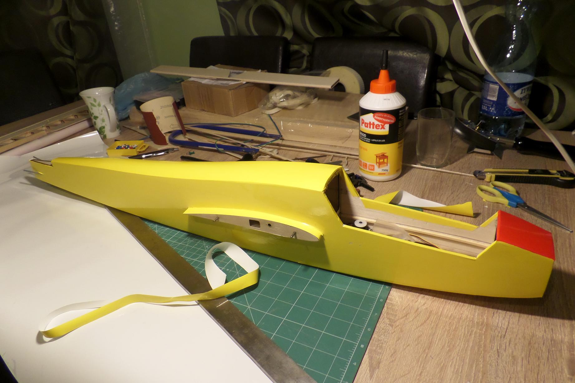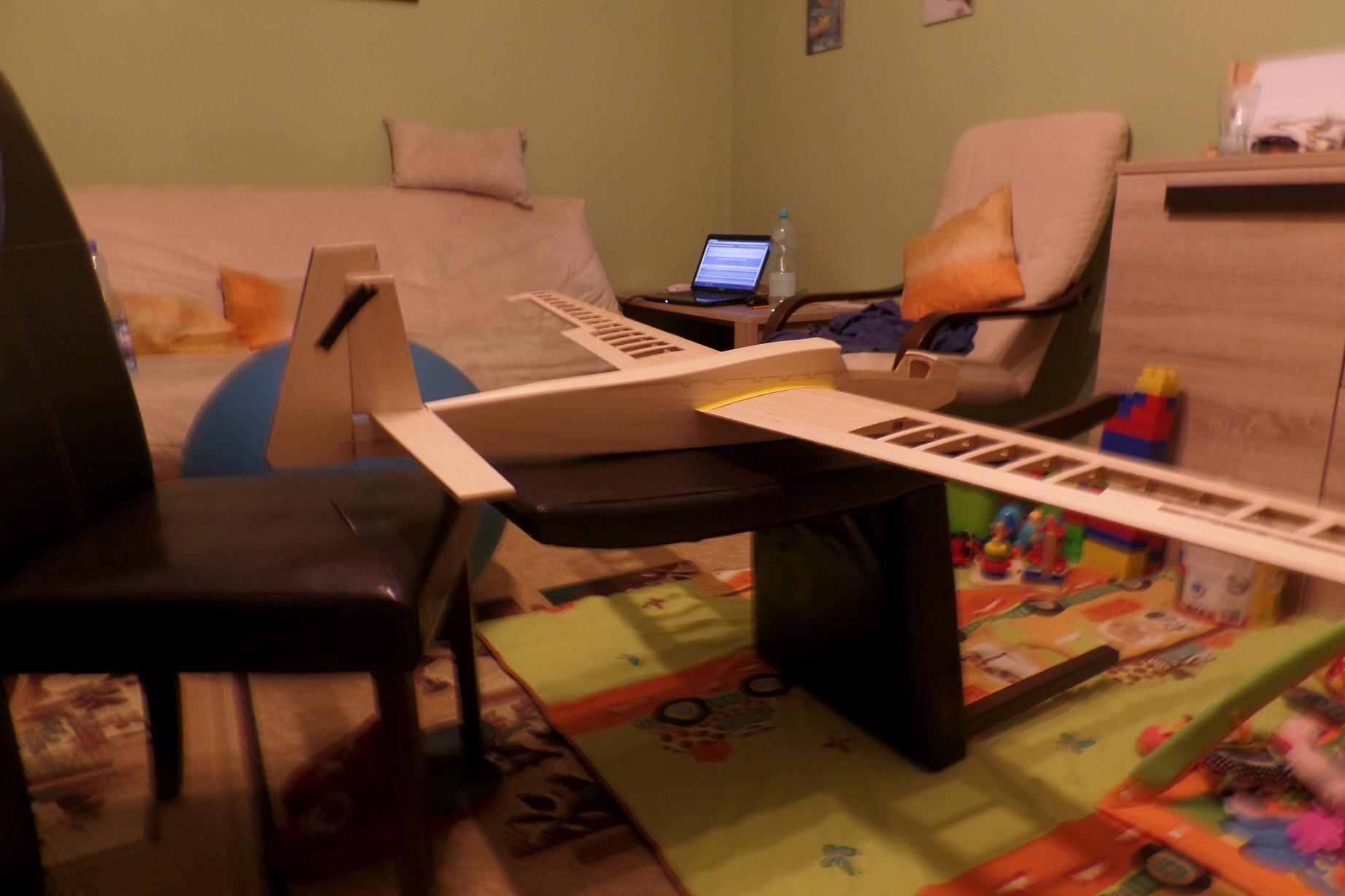 Na chwilę obecną kadłub, z łącznikiem i płatami waży 520 gram.