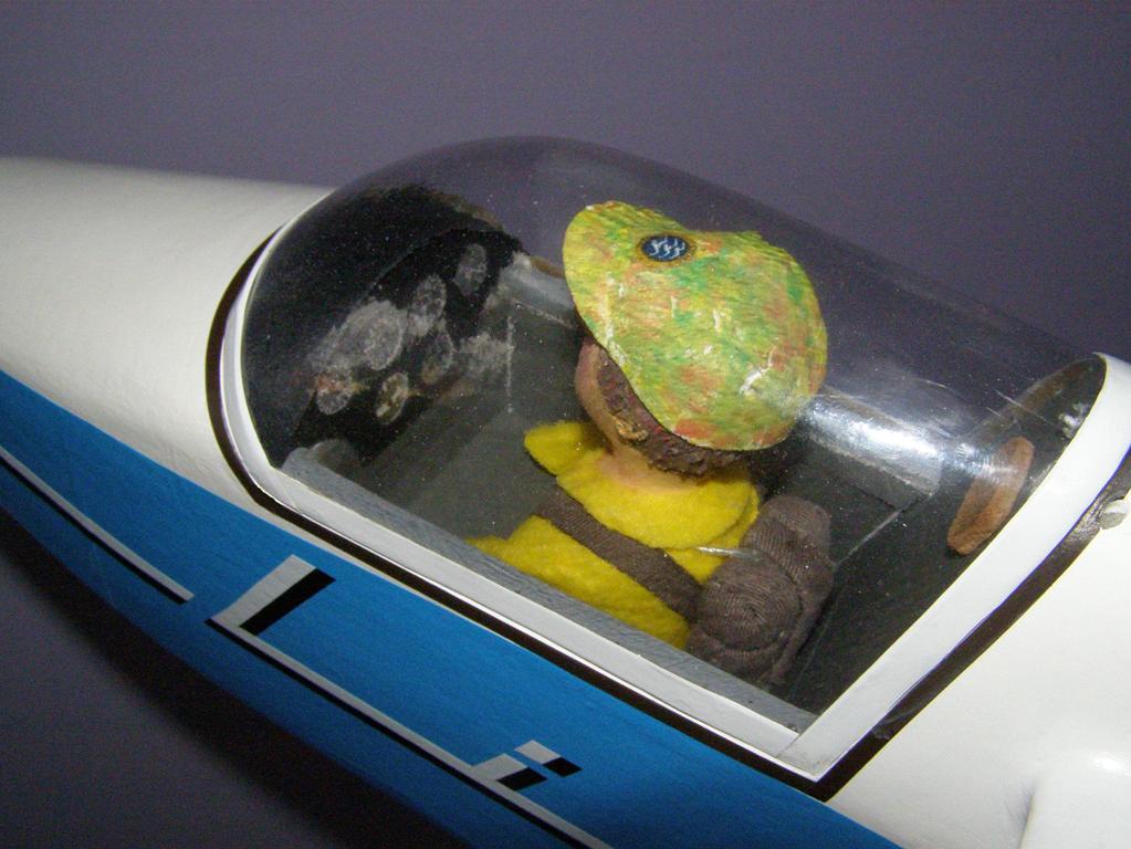 . Jednak nie trudno go będzie rozpoznać wśród innych szybowców. Oczywiście jest w barwach używanego w Aeroklubie Elbląskim. W kabinie obowiązkowo siedzi za sterami młody autor wątku w charakterystycznej kwiecistej czapeczce z froty. Kadłub tak jak w „Jaskółce”’, pokryty papierem japońskim, cellonowany i pomalowany lakierem nitrocelulozowym. Całość wykonana poniżej moich oczekiwań na trzy, też z niewielkim plusem. Z lenistwa dałem ciała nie do końca przygotowując powierzchnię