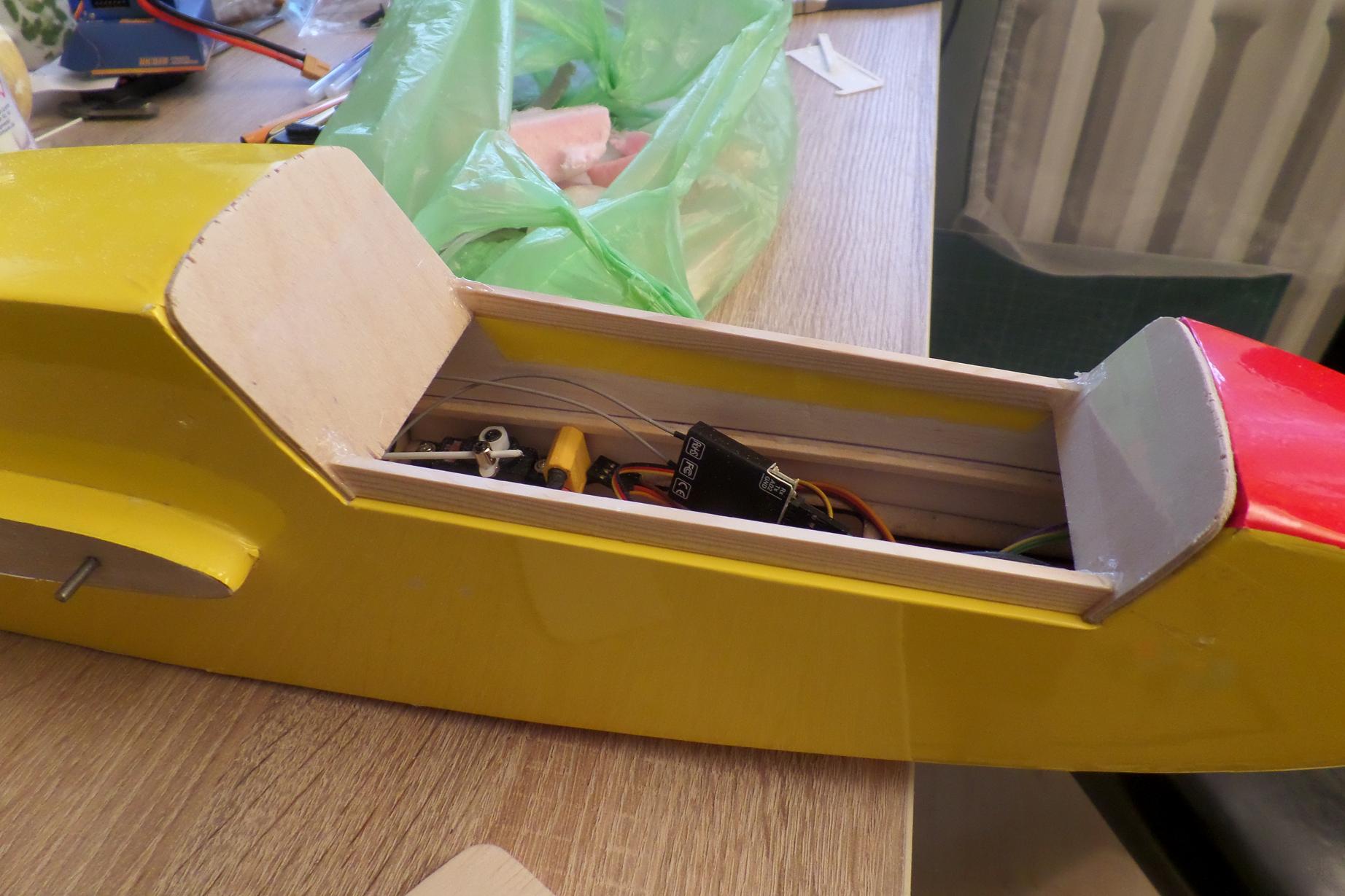Zmniejszyłem pakiet na 1500 mAh, jest lepiej. Jak widać na fotce, pakiet jest w środku kabiny.