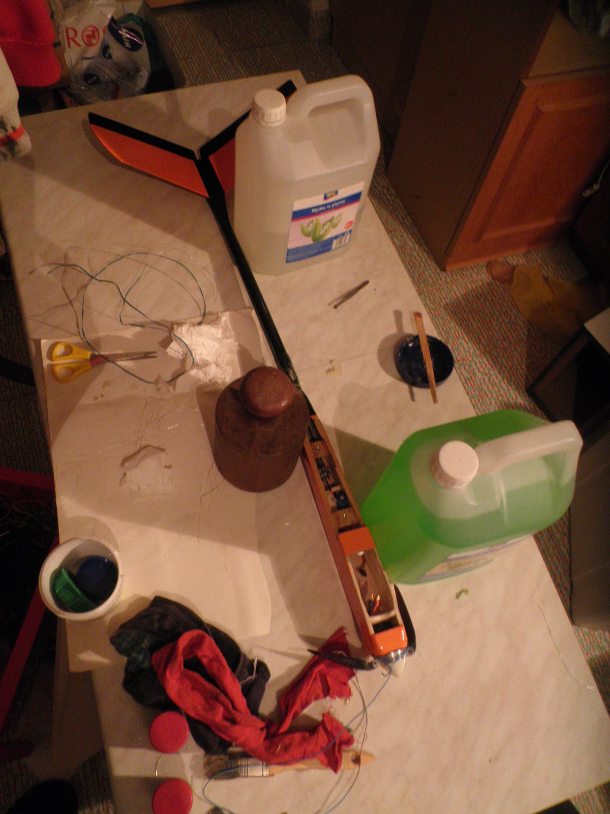 Miejsce które się rozeszło przy mocowaniu klapki zostało zaklejone CA i wzmocnione od wewnątrz tkaniną + Epidan 53, taki wąski pasek. Ciekawe czy wytrzyma kolejne ziemienie. Wyrwane mocowanie skrzydeł wkleiłem też na epidan 53.