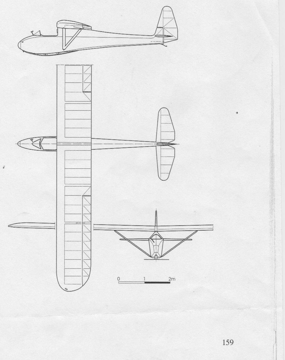 Ponieważ model jest w skali 1 : 3,5 rysunek bazowy z książki powiększyłem kserograficznie tak, aby przedstawiał szybowiec w skali 1 : 35. Ułatwia to wykonanie rysunku wykonawczego modelu w skali 1 : 1 , mnożymy potrzebne wymiary x 10. Sporządziłem rysunki kadłuba w rzucie z góry i z boku , z rozmieszczonymi na podstawie rysunków i zdjęć wręgami i podłużnicami.