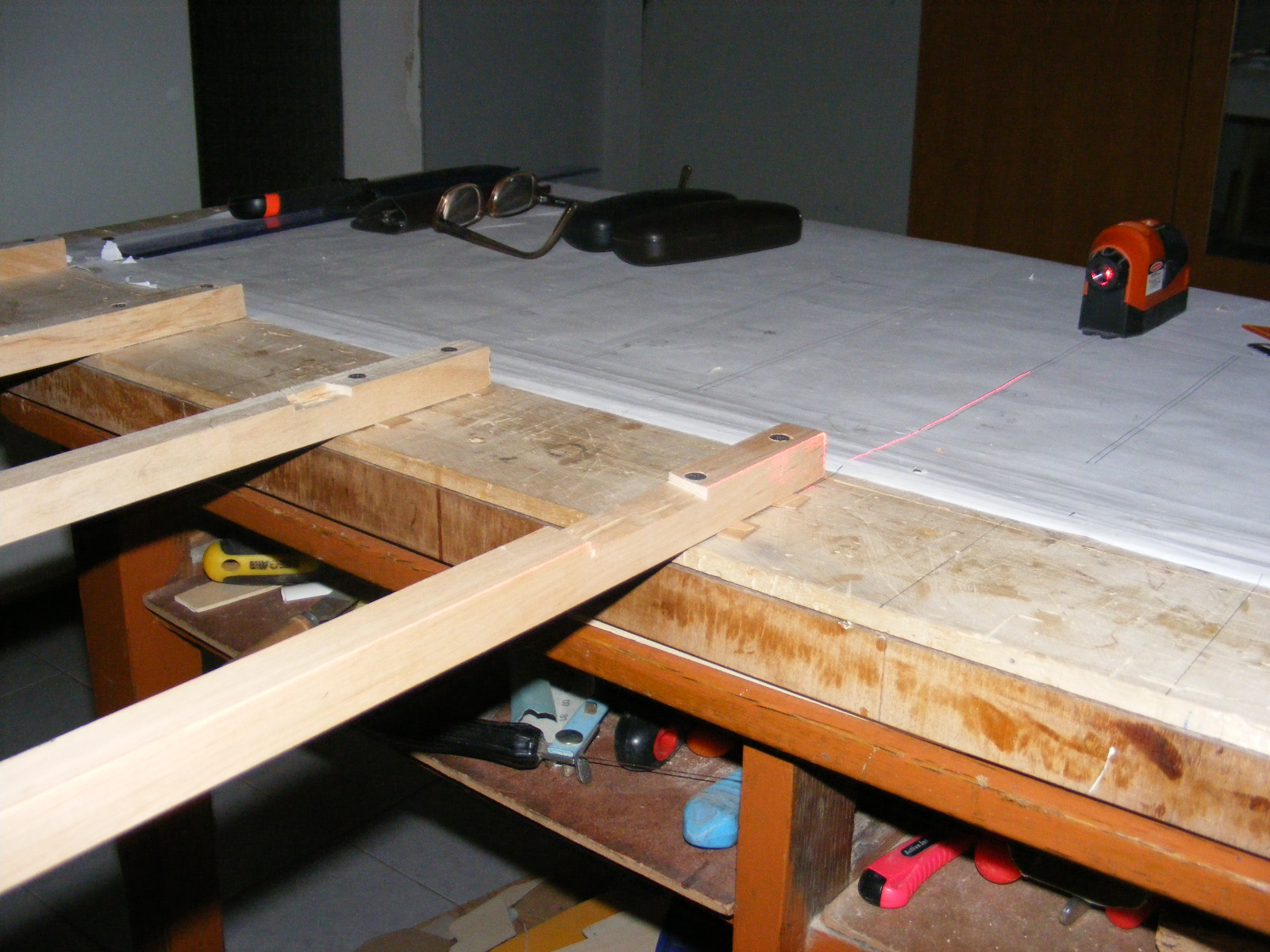 Są różne metody budowy kadłubów, ja zdecydowałem się użyć pomocniczego stelaża. Użyłem listew 2x2 cm , ważne aby były dokładnie kątowe tak aby zachować przy montażu prostopadłość sklejanych elementów . Poszczególne listwy montujemy do stołu tak aby były dokładnie równoległe i tworzyły jedną płaszczyznę inaczej kadłub będzie krzywy. Mój dotychczas prosty stół okazał się w tym momencie krzywy , skorygowałem to podkładkami sklejkowymi .