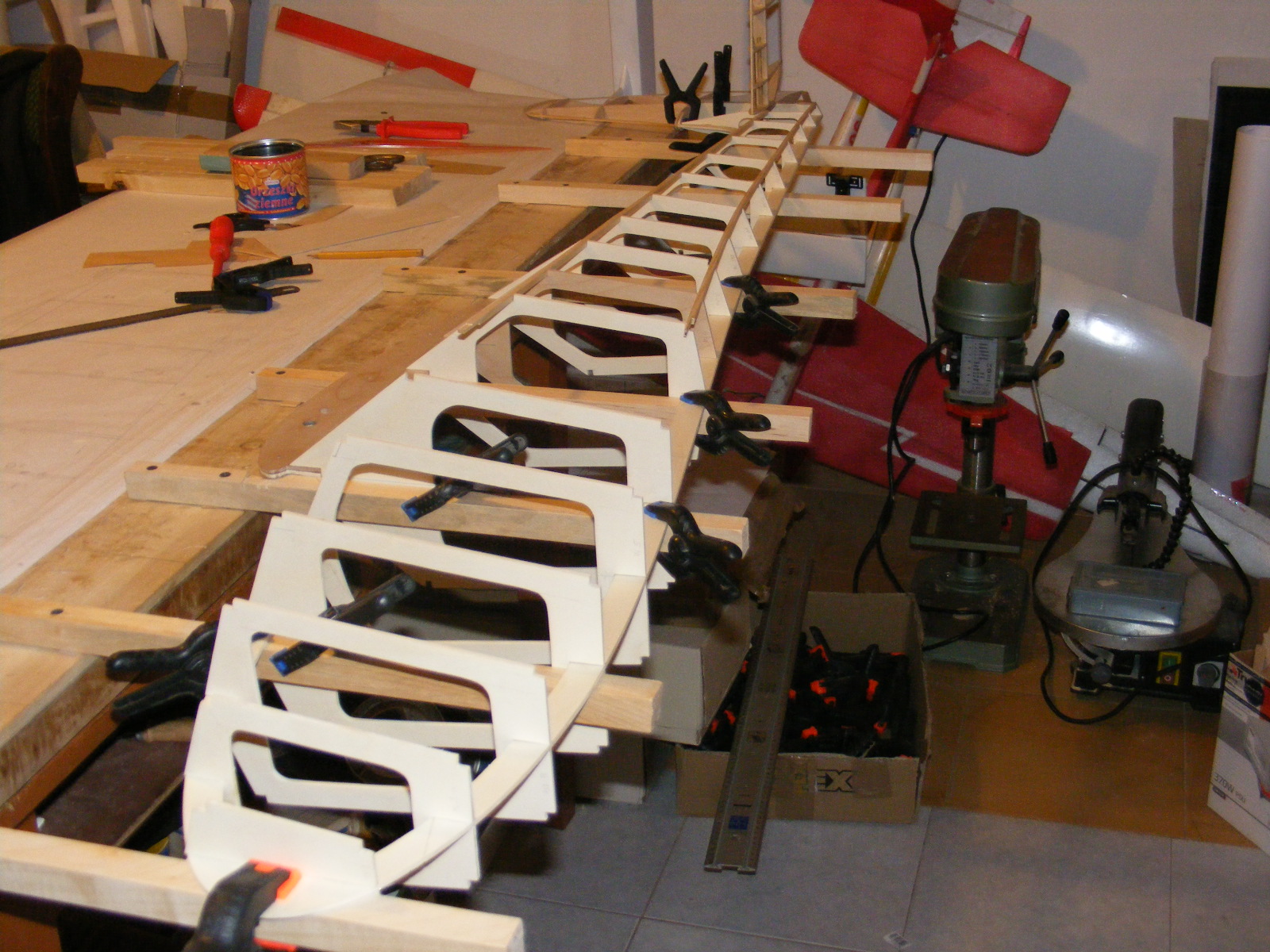 Wręgi przeniosłem na sklejkę topolową przy pomocy kalki maszynowej i wyciąłem wyrzynarką włosową . Główne wręgi ( nośne) wycięte są ze sklejki brzozowej 4 mm.