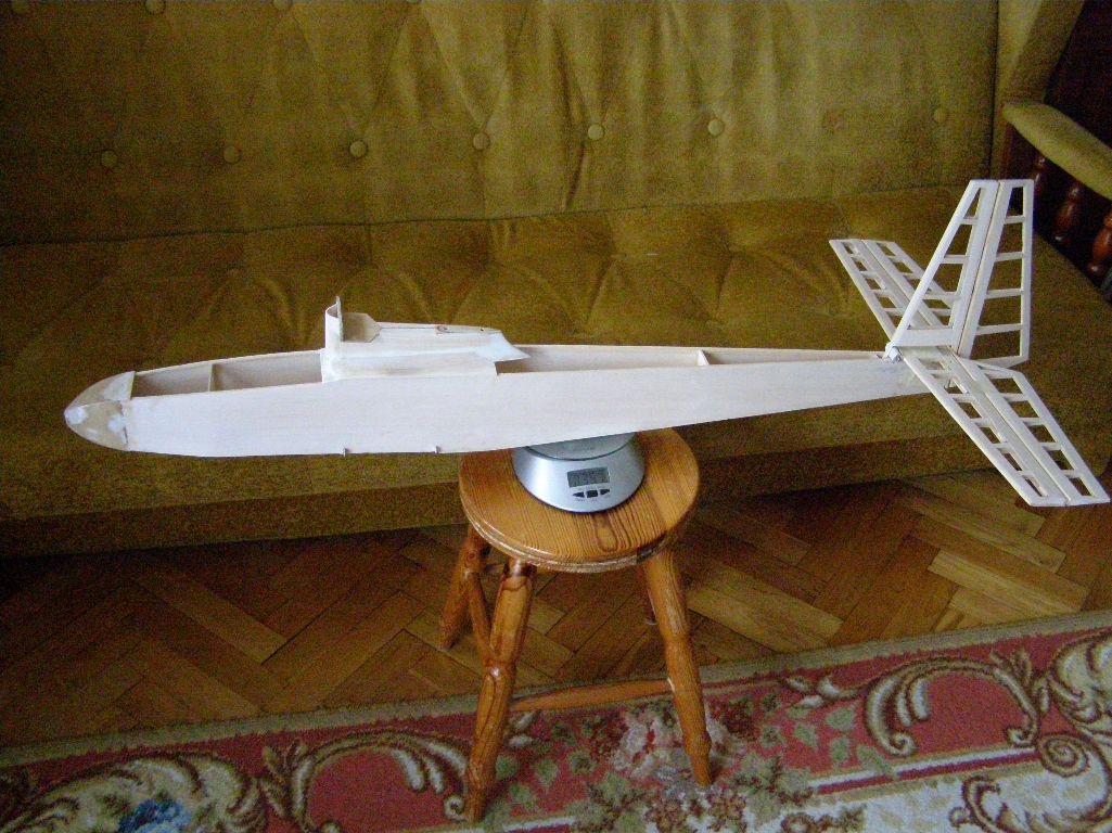 Zmieniłem w tytule tematu na „Bociek” (właśnie taka nazwa prawdopodobnie była mu przypisana). Nie będzie sie mylił z powojennym "Bocianem" ;) . Właściwie kadłub jest już zmajstrowany. :) Przyjdzie jedynie go zamknąć ,wykonać pokrywę i płozę . Więcej już tutaj nic nie przybędzie. Jedynie folia i wyposażenie. Zastanawiam się czy nie wkleić dodatkowej wręgi z balsy w ogonie. Pudło jest sztywne. Dałem dodatkowo sosnowe podłużnice 3X5 wzdłuż balsy. Nie chce już tam więcej nic pchać. Całość z usterzeniem waży 351 gramów. A jest to kawał „drachla”. ;)Teraz przymiarka do skrzydełka .Profil będzie taki jak zasugerował "milo".