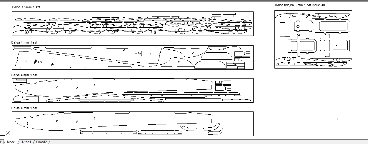 Zakończyłem rysować Muchę, zostały do zrobienia offsety i mostki ;) . Myślę, że dzisiaj to zrobię. Jutro wysyłam do wyceny. Materiały: 1 deska balsy 1,5 mm, 3 deski balsy 4 mm i formatka 320x240 mm balsosklejki 3 mm.