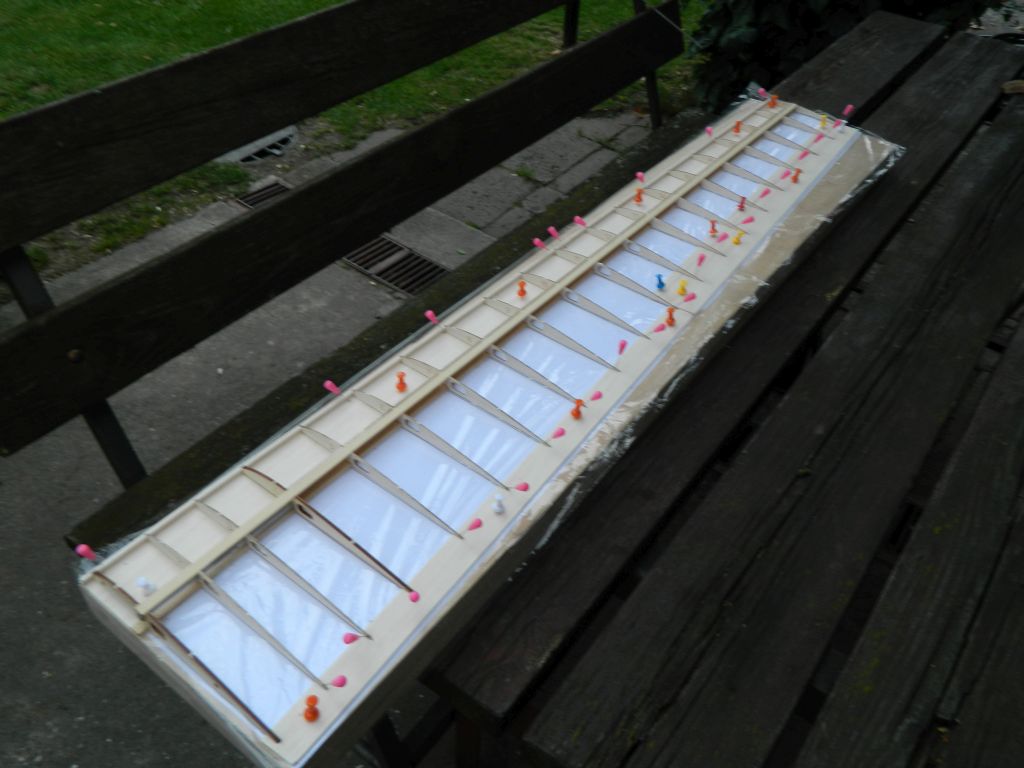 Wydrukowałem plany warsztatowe, z balsy 1,5 mm zamocowałem na desce dolną część kesonu, przykleiłem do niego dolny dźwigar i zamocowałem krawędź spływu, dolną listwę. Teraz można wklejać żeberka :D .