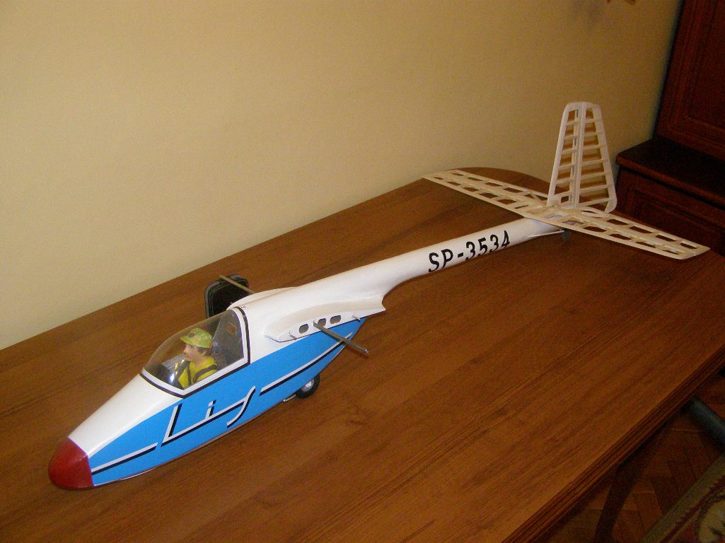 Parę słów z mojej strony. Warunki oblotu wręcz idealne. Ciepło, powyżej 20 st C, wiatr nie przekraczający 3,8 m/s z pd/zach, resztki termiki. Po kilku rzutach z ręki, jak zwykle ;) , i poprawieniu kąta zaklinowania poziomego plus dodatkowy trym na ogon /do poprawki/, model dość stabilnie szybował. Wszystkie reakcje na sterach prawidłowe, bez tendencji do jakiś zwisów, zmian kierunku itp/itd, zapadła decyzja o locie wysokim, z holu. Lot na holu bardzo stabilny i nie sprawiający kłopotów. Wyczepienie. Kilka kliknięć trymerem od SW i szybowiec majestatycznie rozpoczyna lot swobodny. Odczuwam duży zapas stateczności, krążenie trochę "kwadratowe" ale to początek, więc do poprawki - wychylenia SK. Przeciągnięcie: zwalenie się na jedno skrzydło i wejście w ostrą spiralę. Parę kółek, trochę po prostej, lądowanie. Stabilnie i bez jakiś niespodzianek lot ku ziemi, wytrzymanie, przyziemienie , dobieg, na kółeczku. Pełny relaks. Zrobiłem jeszcze 6/7 lotów, w tym dwa Mirek. Model prosty w sterowaniu, bardzo przyjemny, po prostu..... sukces :) . Parę poprawek - moim zdaniem jeszcze 15/20 g można urwać w wyważenia, poprawienie kąta zaklinowania poziomego i kilka innych pierdół....mamy pełnowartościowy model do latania i szkolenia się w pilotażu szybowcowym :D . Świetnie prezentuje się w locie, a zupełnie niesamowity wygląd w czasie podejścia do lądowania :D . Zmiany jakie wprowadził Mirek zupełnie nie wpływają na wygląd szybowca, ale bardzo mocno na jego własności. Oczywiście nie jest to model o dużych osiągach, ale dający, pomimo to, mnóstwo radochy i niezapomnianych wrażeń :D .