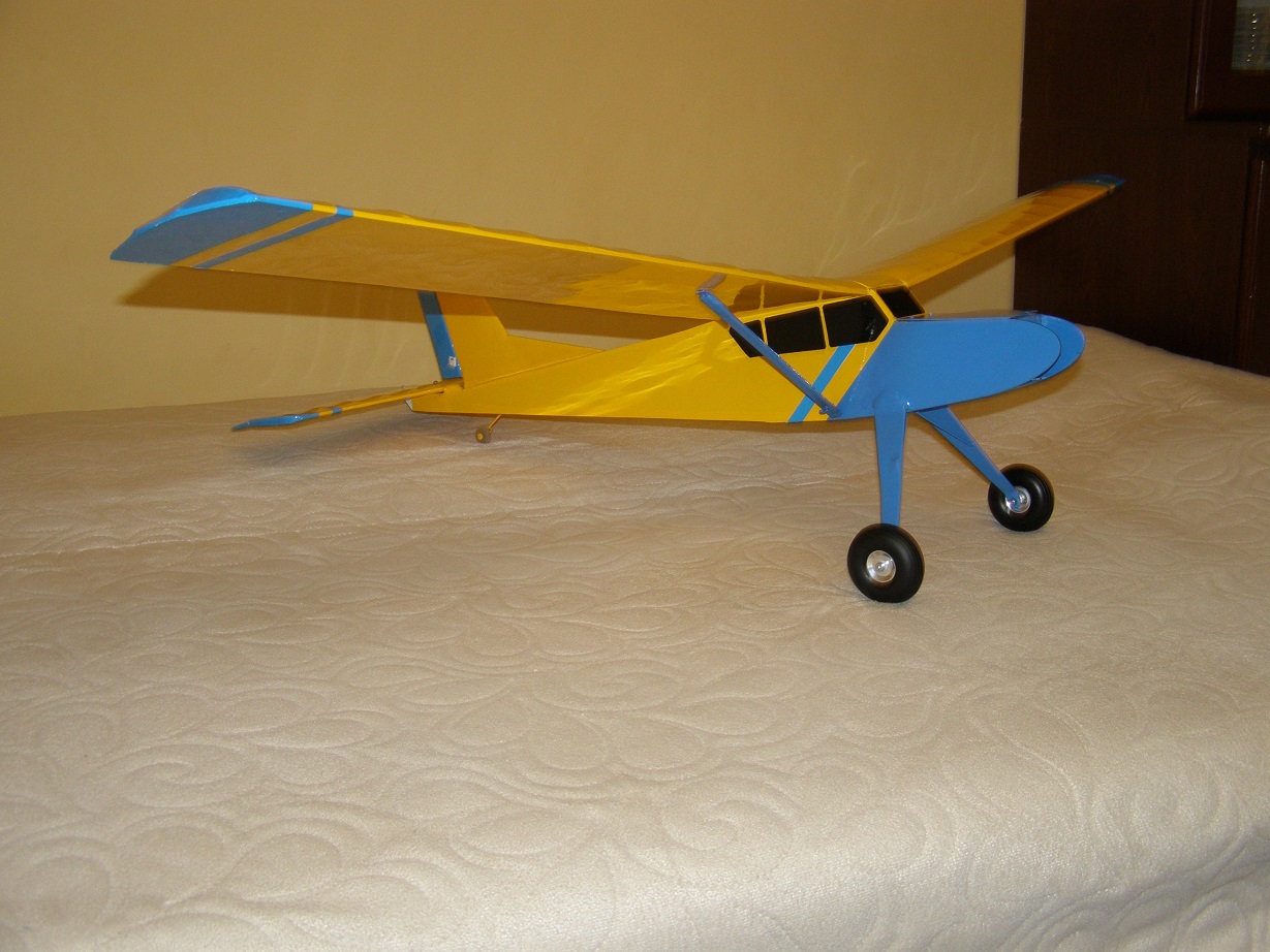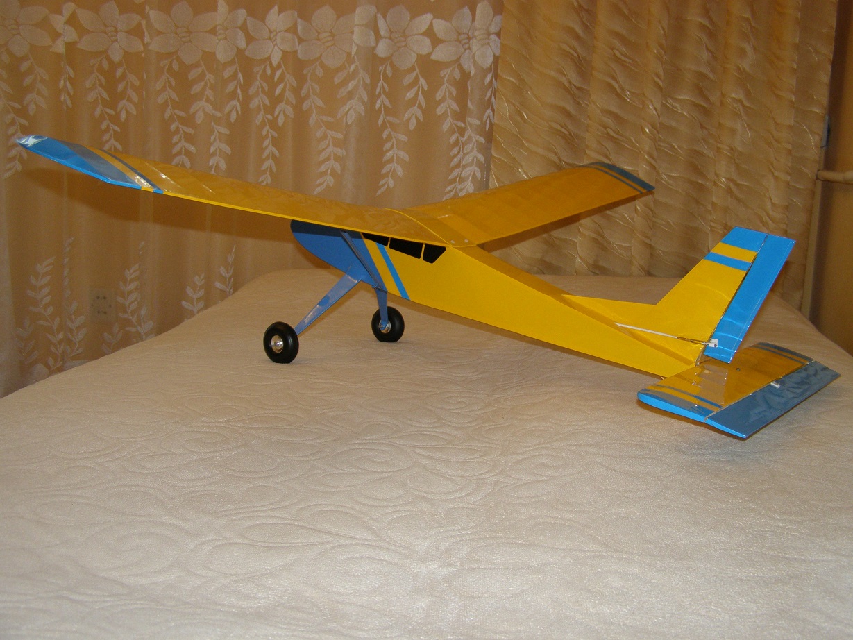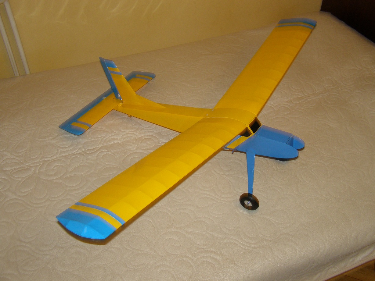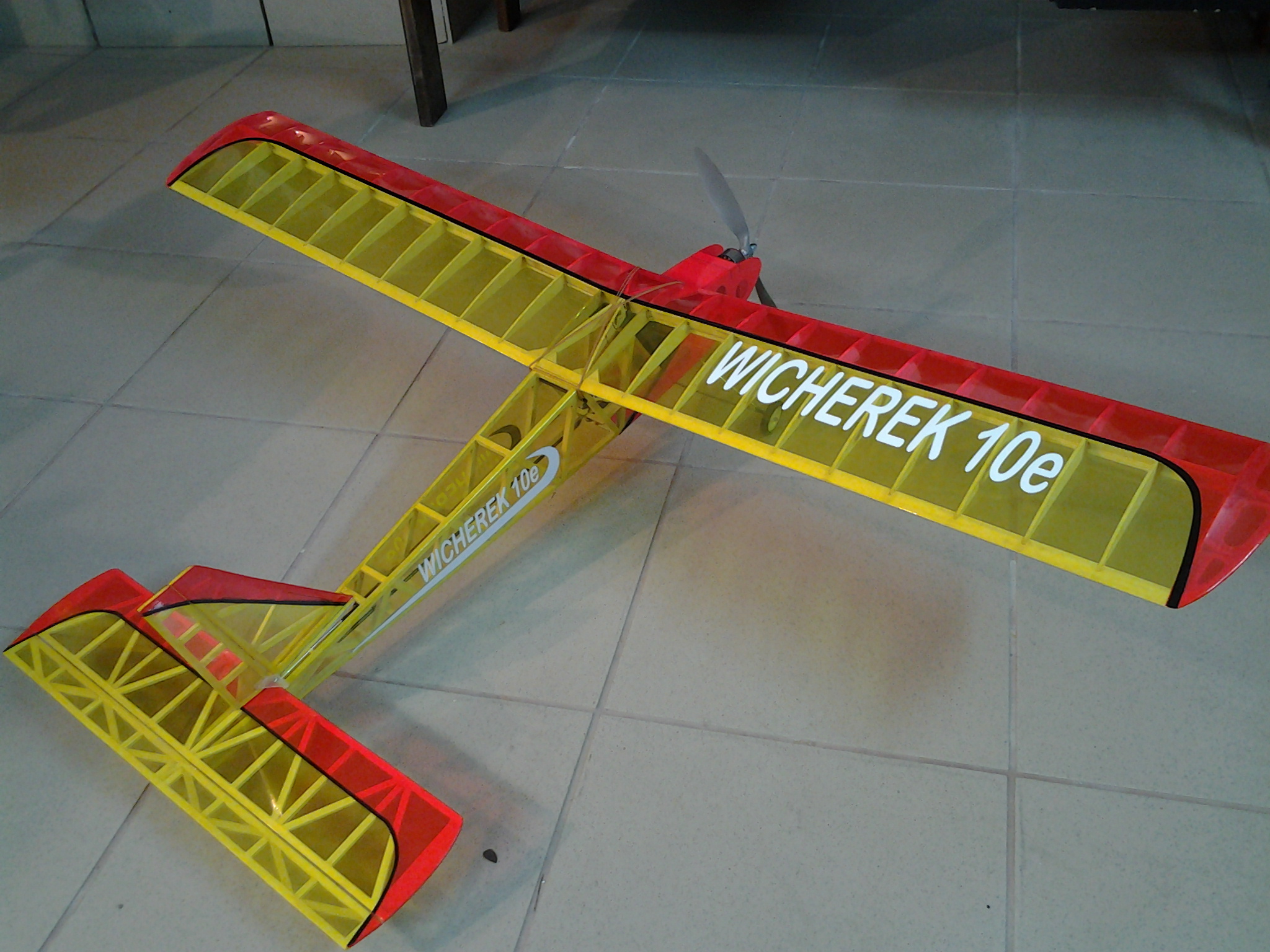 . Może jednak da się go odrestaurować. Budowany co prawda w kryzysie na początku lat osiemdziesiątych z byle czego dla syna (w sklepach na półkach był tylko ocet) ,ale całkiem przyzwoicie wygląda. Zerwałem pokrycie z natronu (taki cienki papier brązowy w prążki służący do pakowania) i do roboty. Postanowiłem przeprowadzić konwersję ze spaliny na elektryka. Po pierwsze, wywaliłem usterzenie. Zrobiłem je w wersji szybowcowej. Przedłużyłem mordkę i wykonałem wznios skrzydeł powyżej 6 stopni. Podwozie wykonałem wyższe z większymi kółkami. Oczywiście klapy wziernikowe do pakietu i pólka na serwa. To tyle. Całość została pokryta folią Oracower.