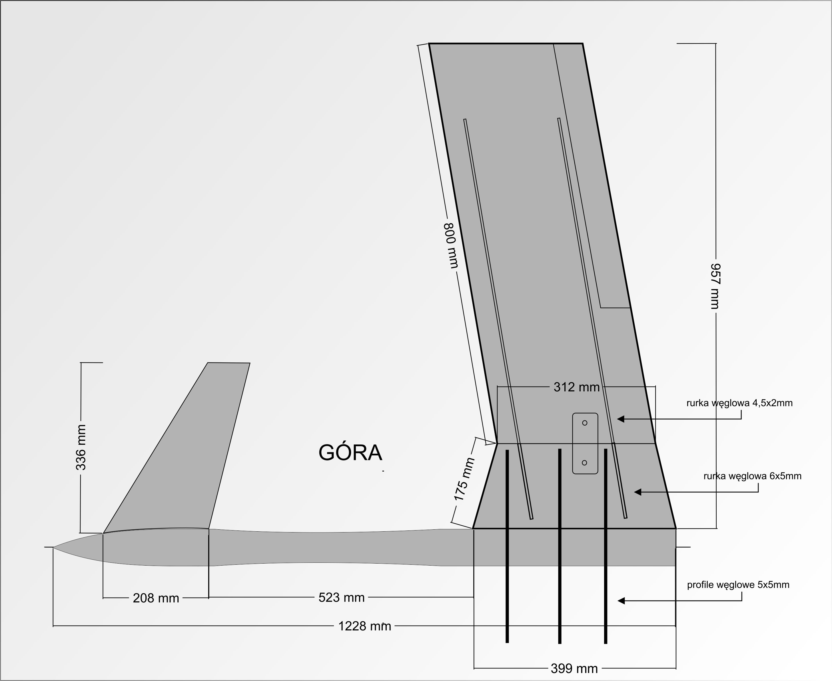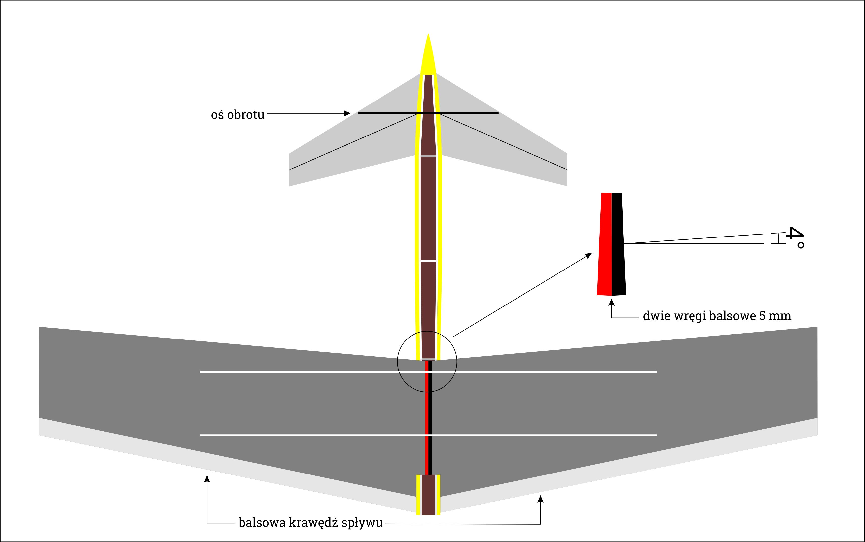 Ster kierunku jak zauważyłeś nie jest potrzebny. Wystarczą stateczniki poziome które zapewnią stateczność kierunkową. Duży wznios skrzydła (4°) zapewni dużą stabilność poprzeczną.