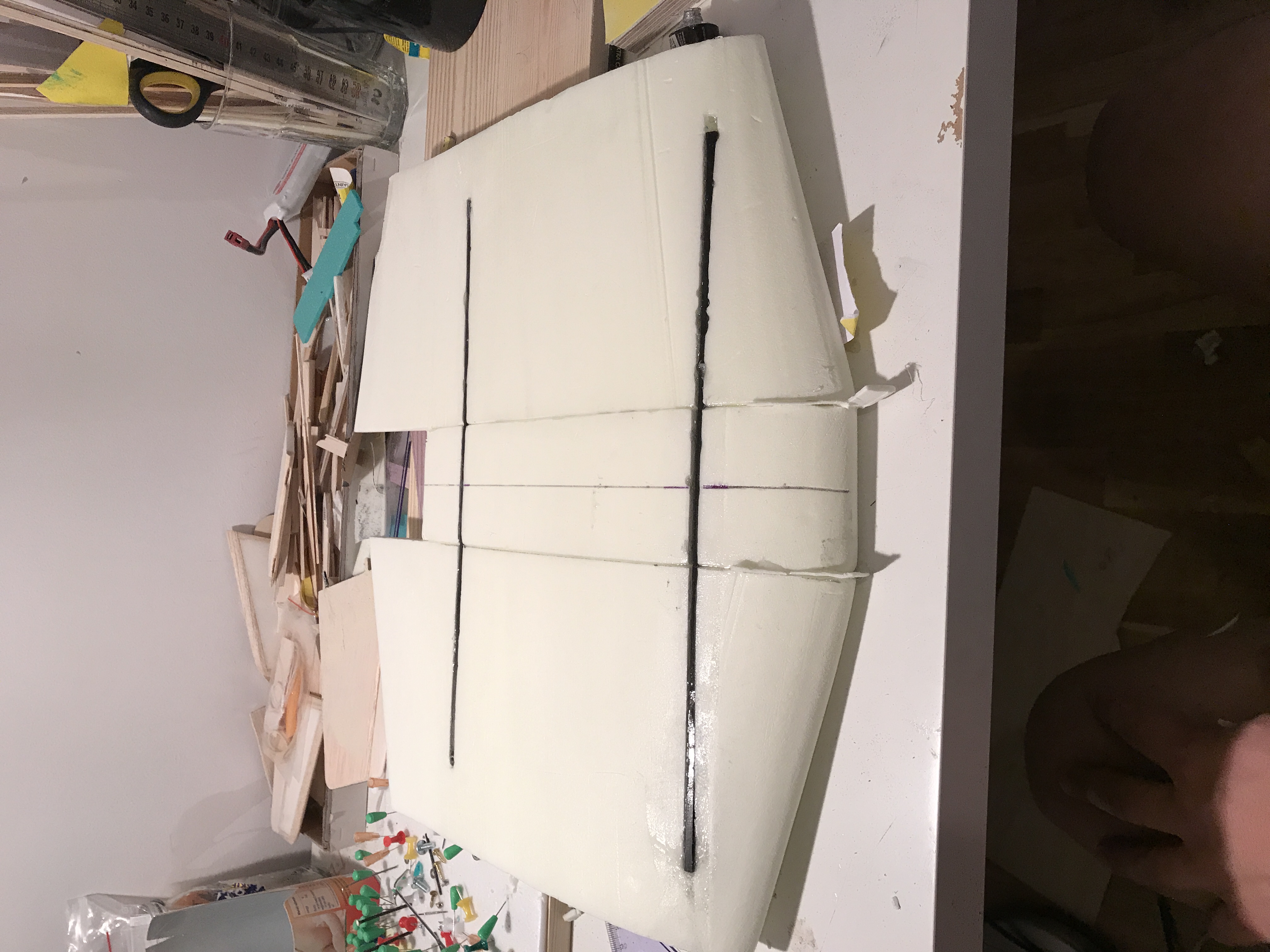 Centropłat wykonałem gorącym drutem z XPS'u i wzmocniłem od góry trzema profilami węglowymi 5x5 mm (ale chyba zamotuje je też na dole). Na dolnej części centropłata po dwie węglowe pochewki z rurki węglowej 6x5 mm. W skrzydłach wycięte gorącym drutem w styropianie. Wzmocnienie po dwie rurki węglowe 4,5mm wklejone klejem epoksy i balsowa krawędź spływu, myślę czy by nie dać również balsy na natarcie, żeby zwiększyć sztywność skrzydła? W miejscu styku centropłata i skrzydła wklejone balsowe wręgi.