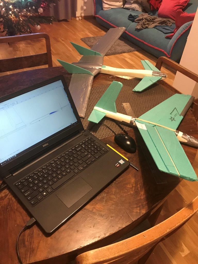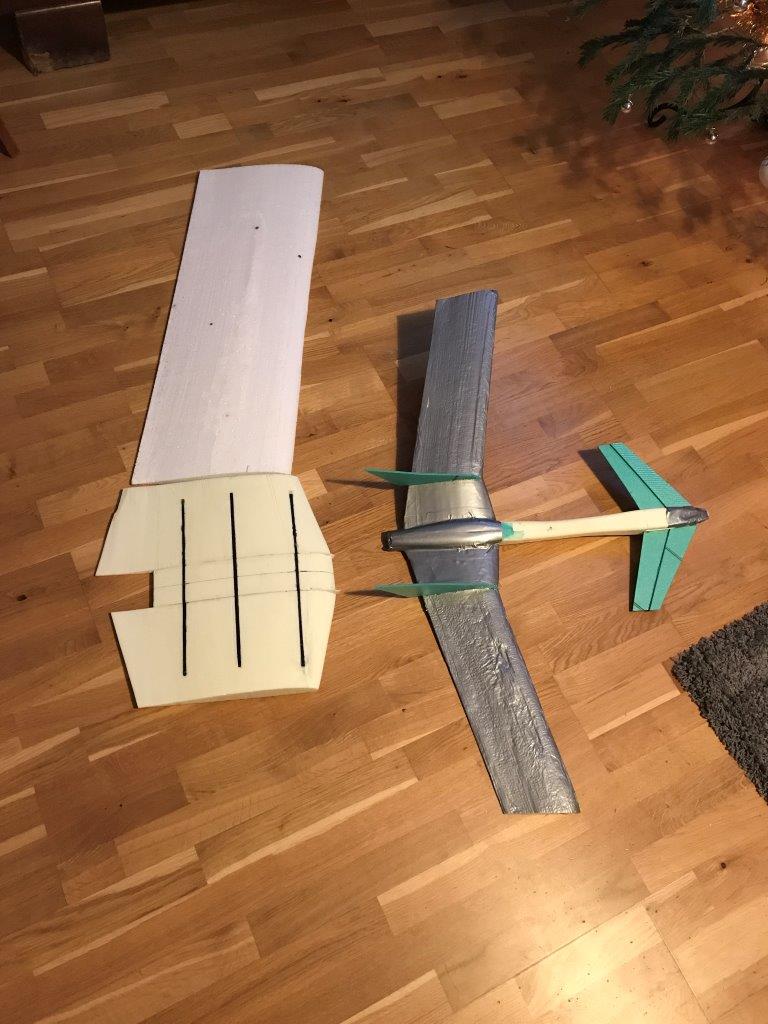 Profil skrzydła S5010 (samo stabilizujący) cięciwa przy kadłubie 399 mm, rozpiętość wyjdzie 1988 mm. Założenie było takie, że model nie będzie miał steru kierunku, tylko sterowanie lotkami i nieruchome listwy do stabilizacji poprzecznej. Canard na profilu KFM2. Silnik będzie zamontowany z tyłu ze śmigłem pchającym. Silnik będzie osadzony na ruchomej płytce do sterowanie wektorem ciągu w płaszczyźnie pionowej.