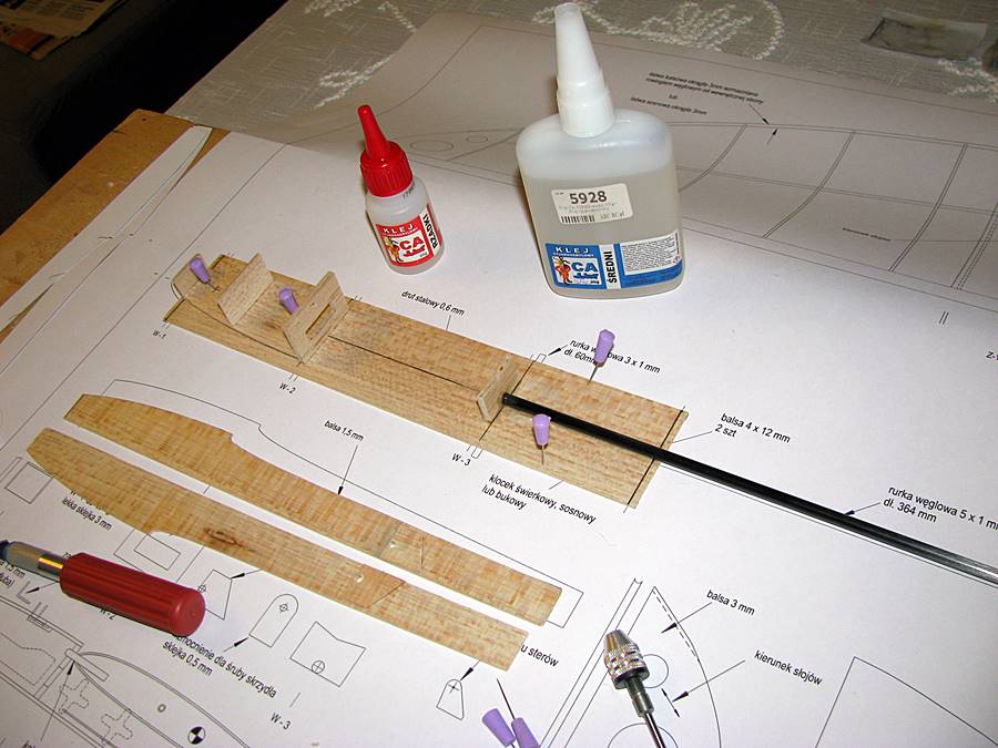 Następnie przyklejenie, na planie, belki kadłuba. Klej - średni CA: