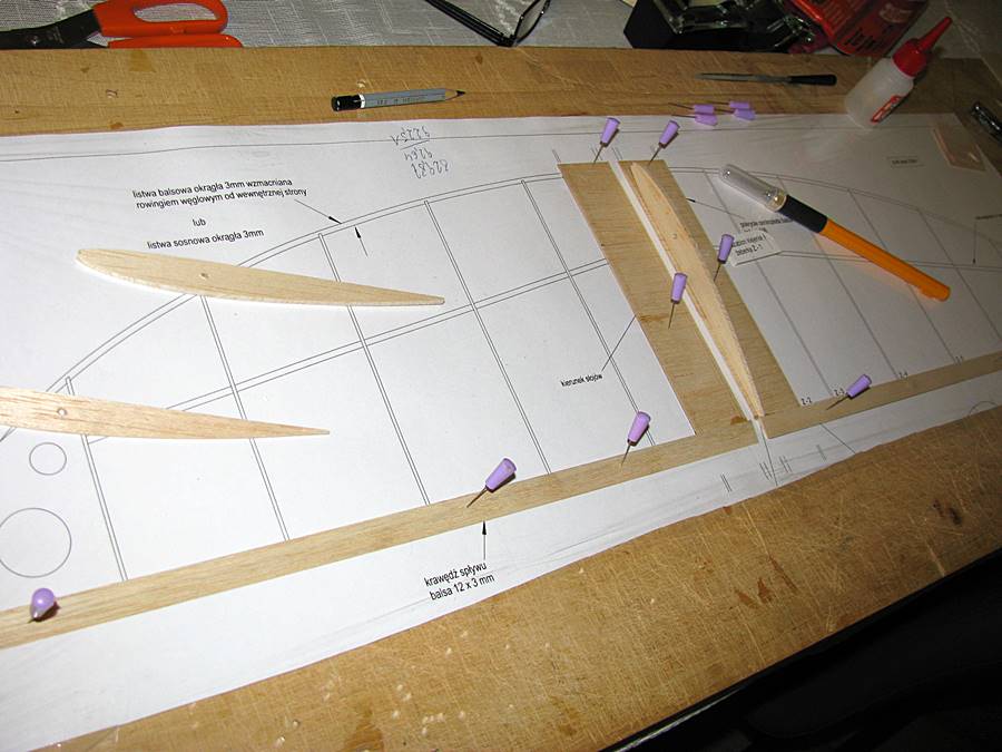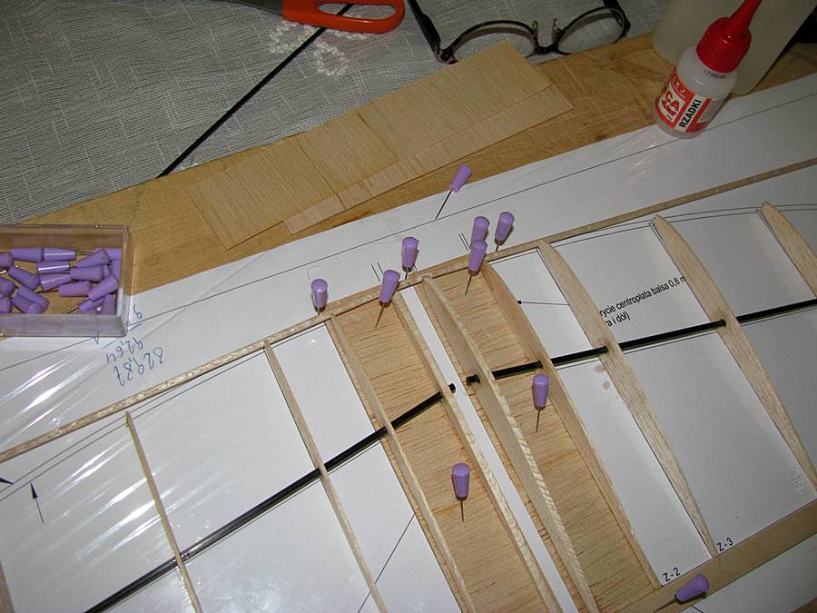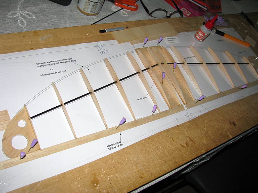 Najpierw wycięta formatka spodu kadłuba, zaznaczenie położenia wręg, przypięcie do planu i przyklejenie wręg. Klej - rzadki CA: