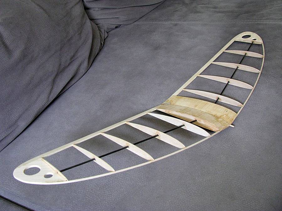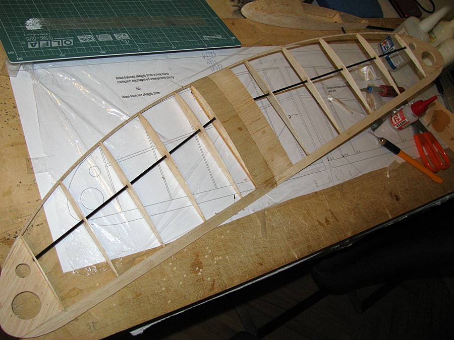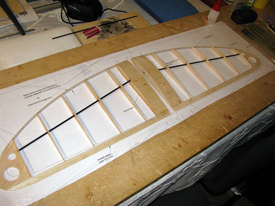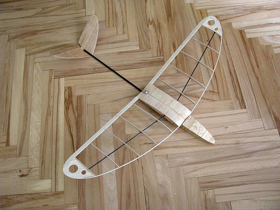 Budowa:Kadłub wykonany z balsy 1,5 mm, wręgi ze sklejki balsowej 3 mm, belka kadłuba - rurka węglowa 5/4 mm.