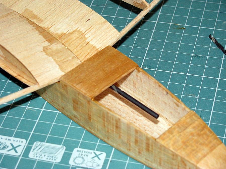 Jeszcze tylko wklejenie kołka startowego (rurka węglowa 3/2 mm - średni CA). Waga kadłuba na tym etapie - 13,63 g.: