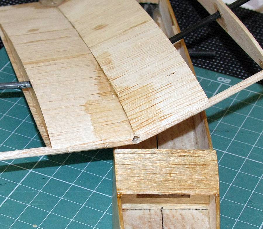 Kolejny etap to przyklejenie przednich, górnych pokryw kadłuba (balsa 1,5 mm), zachowując odpowiedni odstęp na pokrywę dla zamontowania wyposarzenia. Klej - rzadki CA: