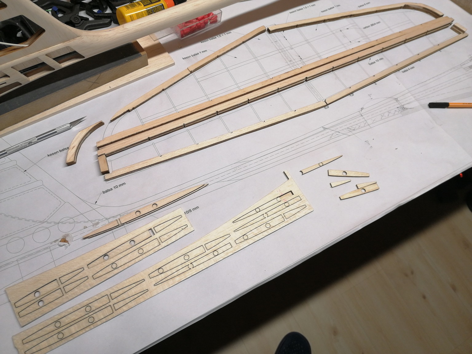 Wczoraj skleiłem 3 formatki balsy 1 mm aby z jednego płata 300x1000mm wyciąć pokrycie statecznika poziomego.