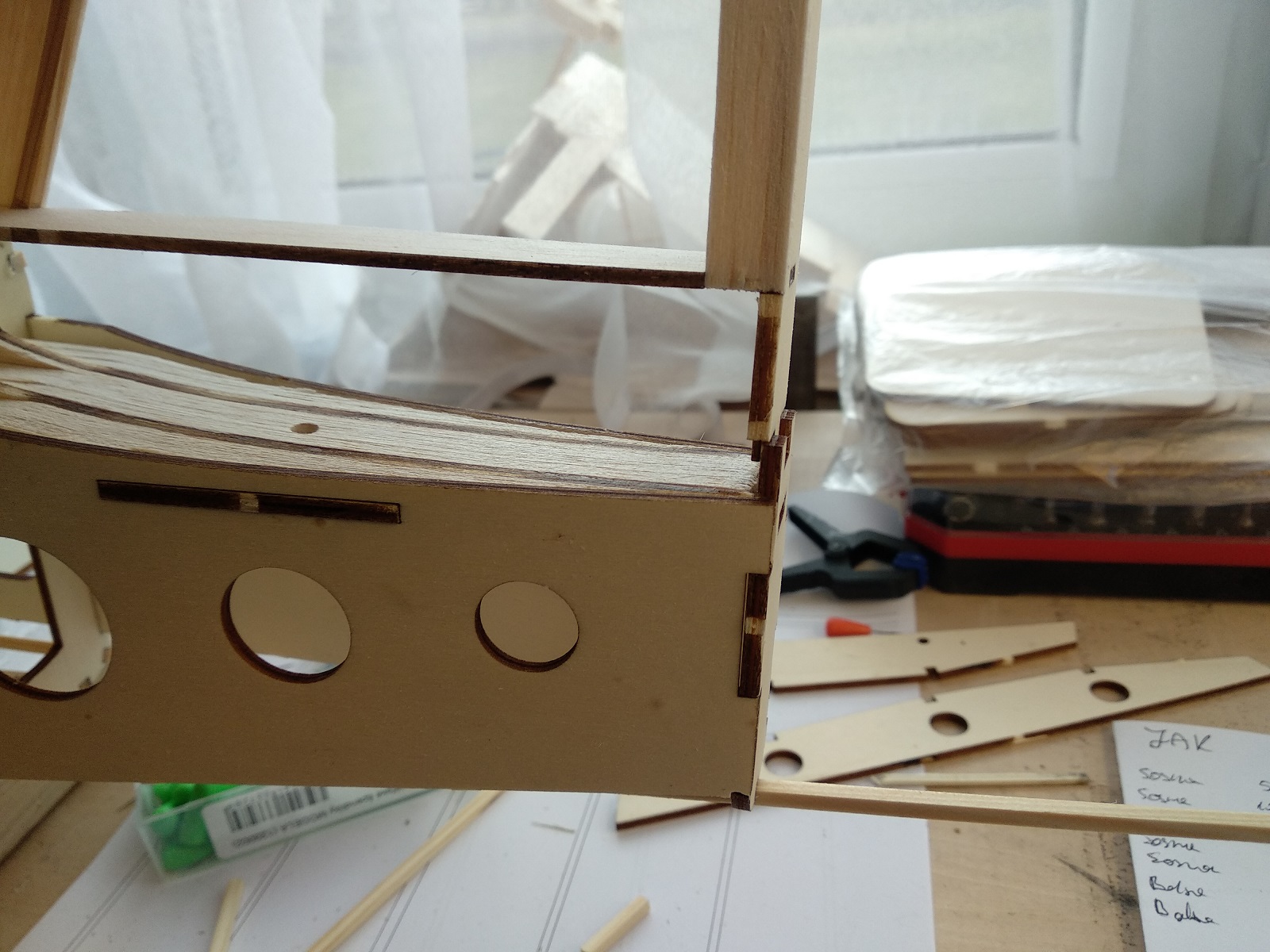 W boczku na dole jest (powinien być) spory wpust - tu tylko nacięty zarys, dzięki temu, że boczki z balsosklejki, po prostu przeciąłem nożem wzdłuż linii.