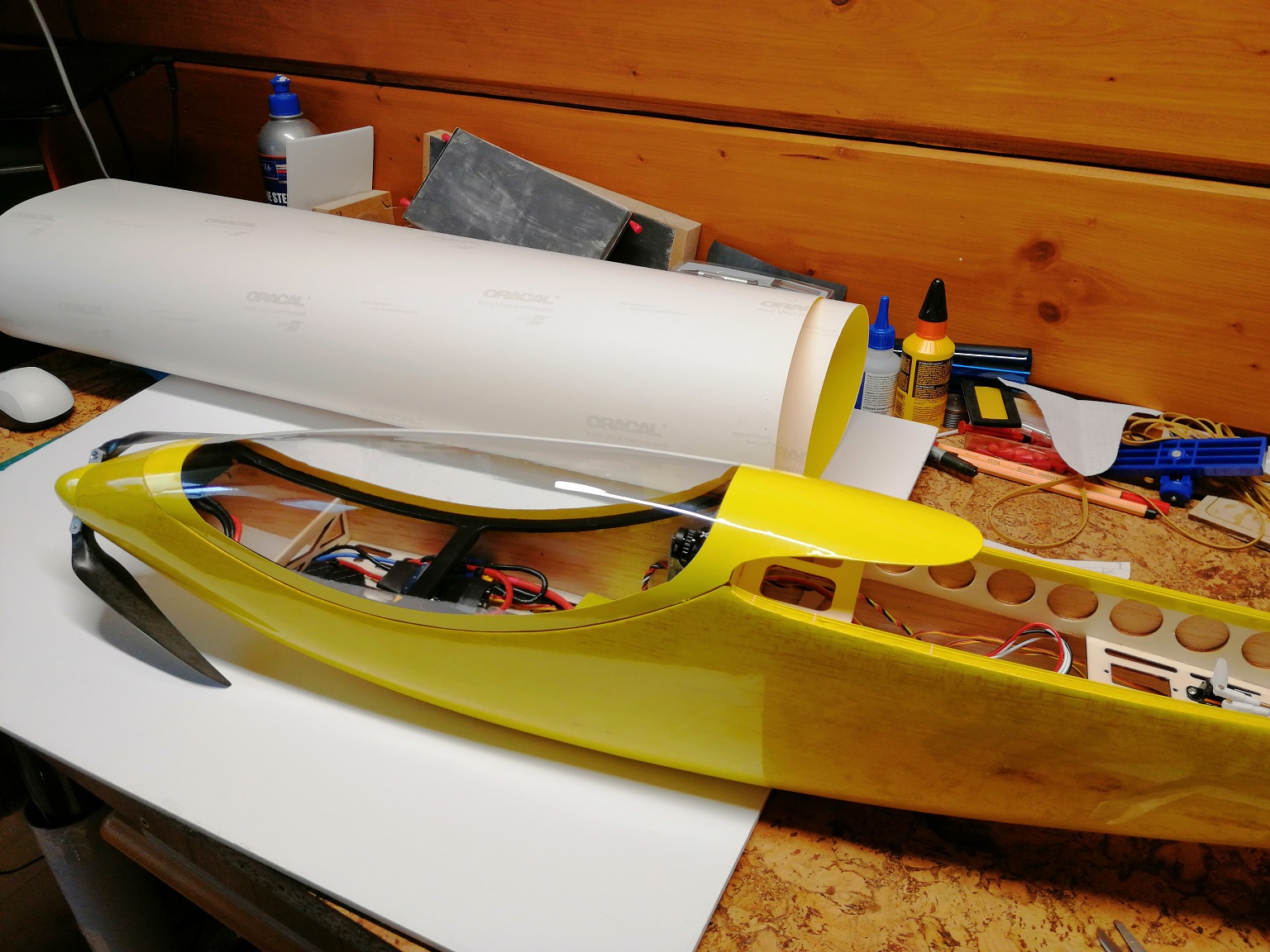 tak, zastanawiam się czy okleić kadłub w tej części na żółto folią, czy raczej imitacją kompozytu węglowego 3D. Ramka kabinki musi mieć ten sam kolor co kadłub.