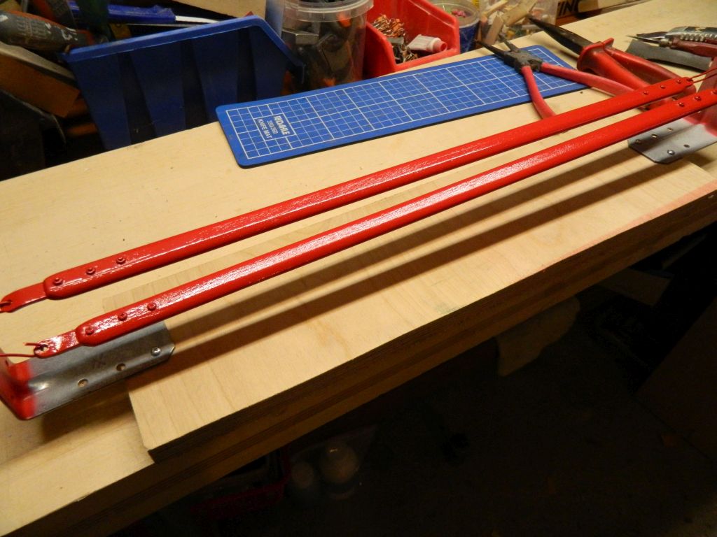 Po drugie, zastrzały. Powyginały się, przestały spełniać swoją rolę. Kawałek listwy sosnowej 8x8, okucia z pierwszej wersji. Wszystko wklejone na klej epoksydowy i skręcone śrubami M2. Natarcie i spływ zastrzału będzie oklejony balsą, oszlifowane i pomalowane.